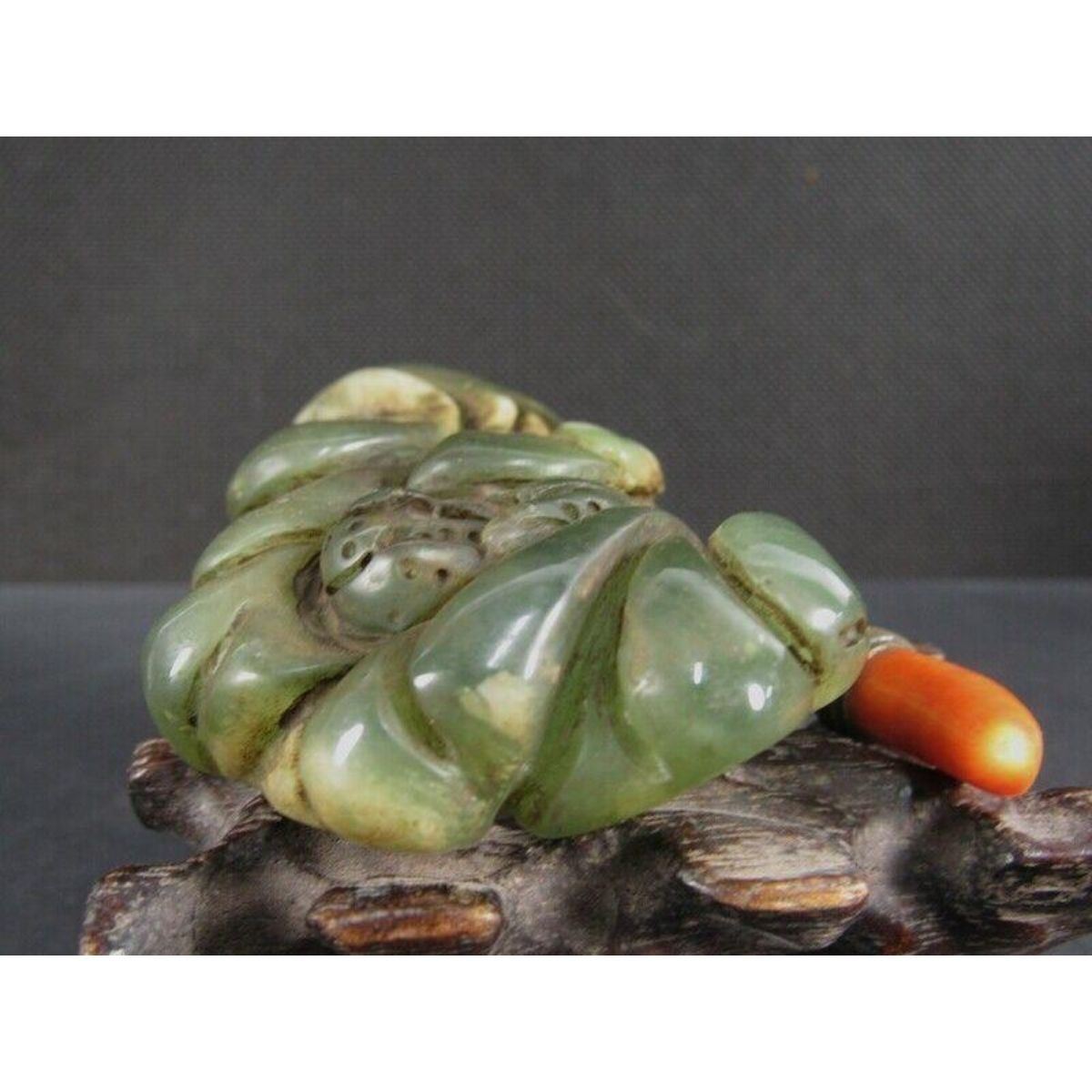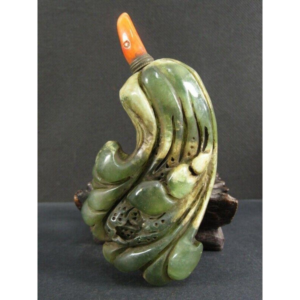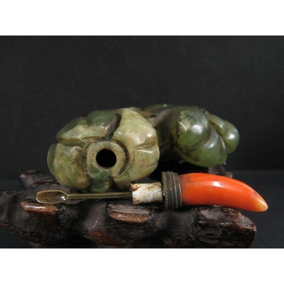 Chinese cabbage carved jade snuff, medicine bottle with red coral top & brass scoop spoon. 4.8" H X 2.2" W X 1" thick.