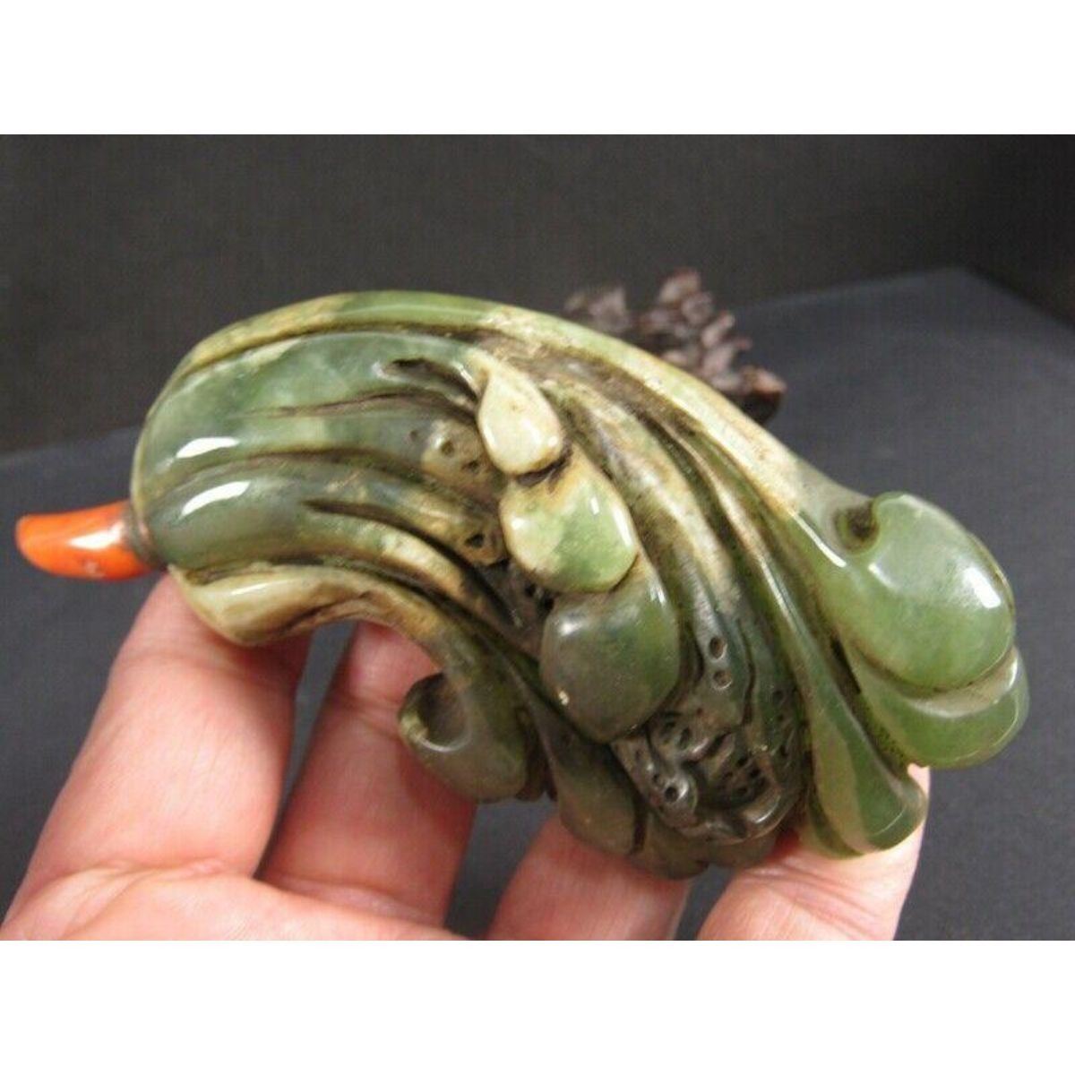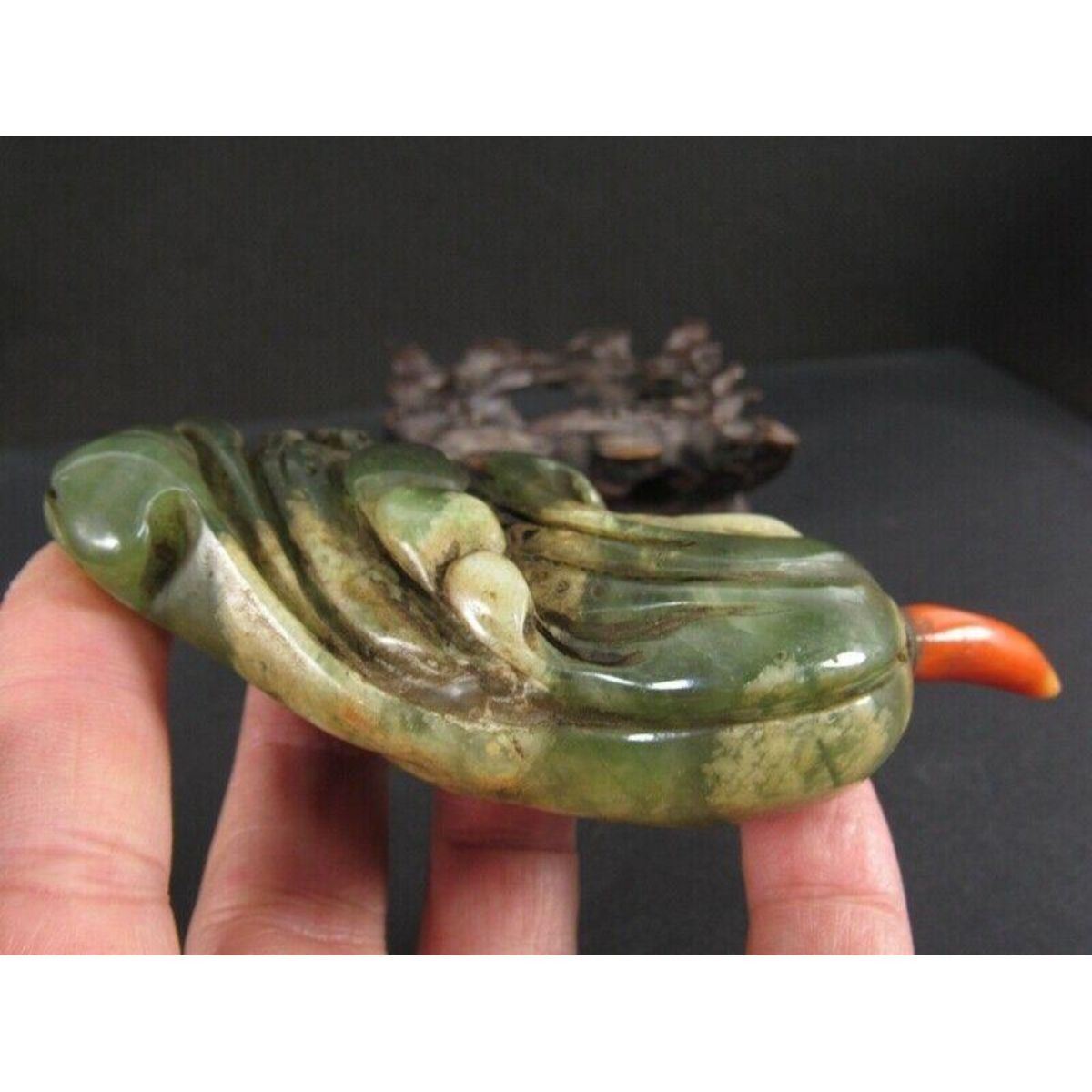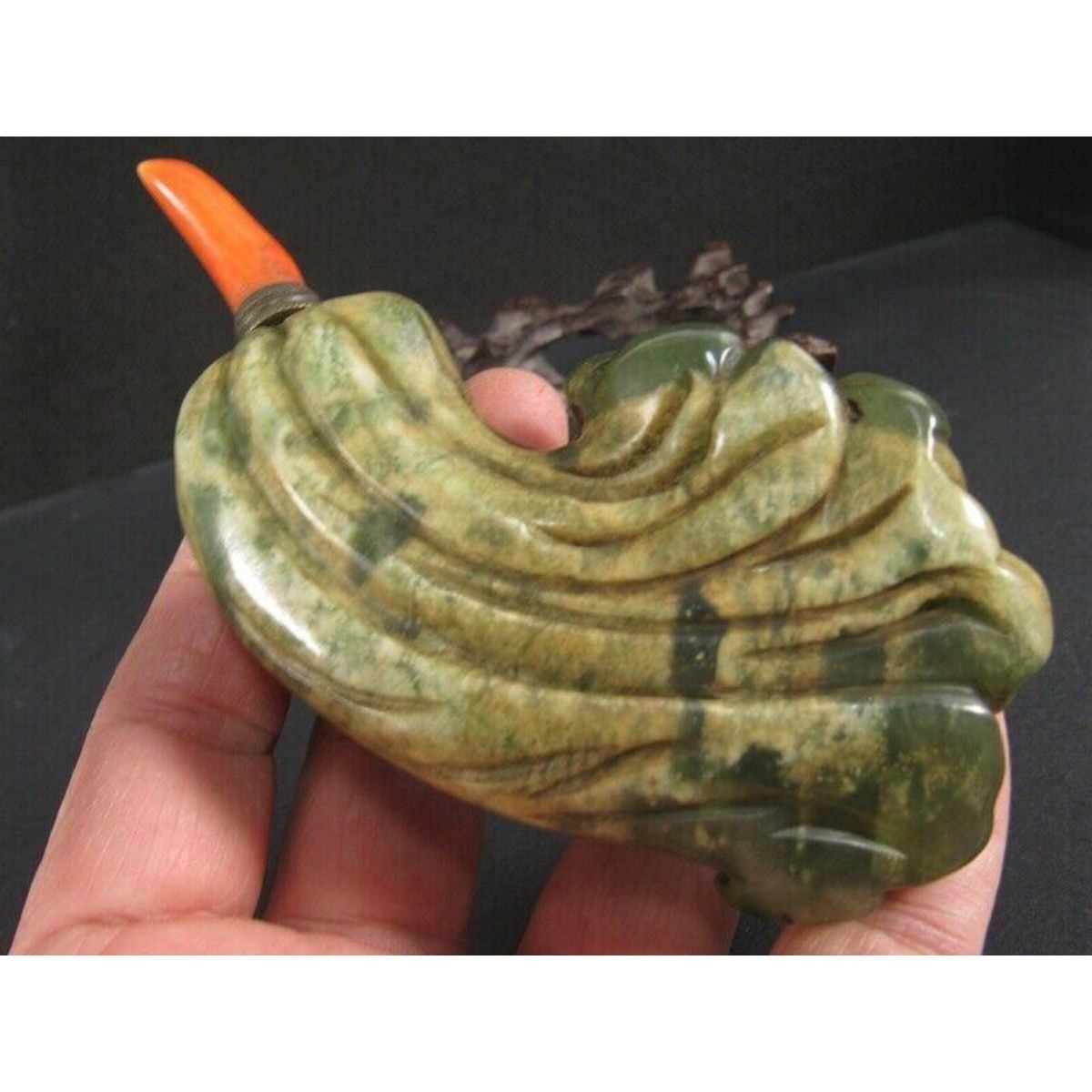 Chinese cabbage carved jade snuff, medicine bottle with red coral top & brass scoop spoon. 4.8" H X 2.2" W X 1" thick.