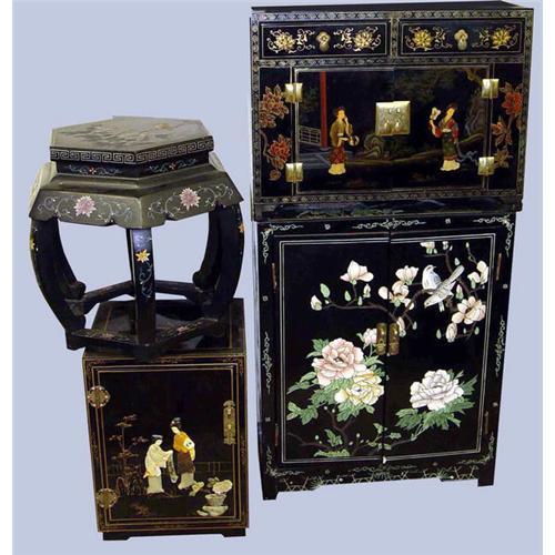 Vintage suite of 3 Chinese black laquor cabinets and a garden bench. The bench 21 inches in diameter by 18.5 inches height and the larger cabinet 30 inches high x 23.25 inches length x 11 width are late 20th century and bear hand painted floral and bird motif, where as the other two cabinets 19.5 inches height, 14 inches width x 12.25 inches length and 24 inches height x 18 inches length x 12 inches width are early 20th century and with jade, natural stone and 1vory inlay and depicts a splendid pair of girls tending to hobbies or chores in the garden court yard. This suite does not take up much room, however is very charming and would make a superb addition to any fine household or collection.