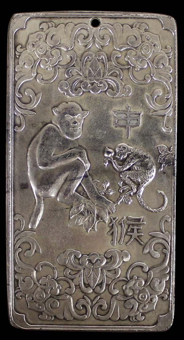 Vintage Chinese Calendar Year of the Monkey Silver Bullion Bar, .999, beautifully cast with an ox on the front and the Chinese horoscope wheel of twelve zodiac symbols on the reverse, along with the Chinese stamp for silver weighs approximately 135g, post 1940's, measures 3.75''L x 2''W x 1/8''Deep