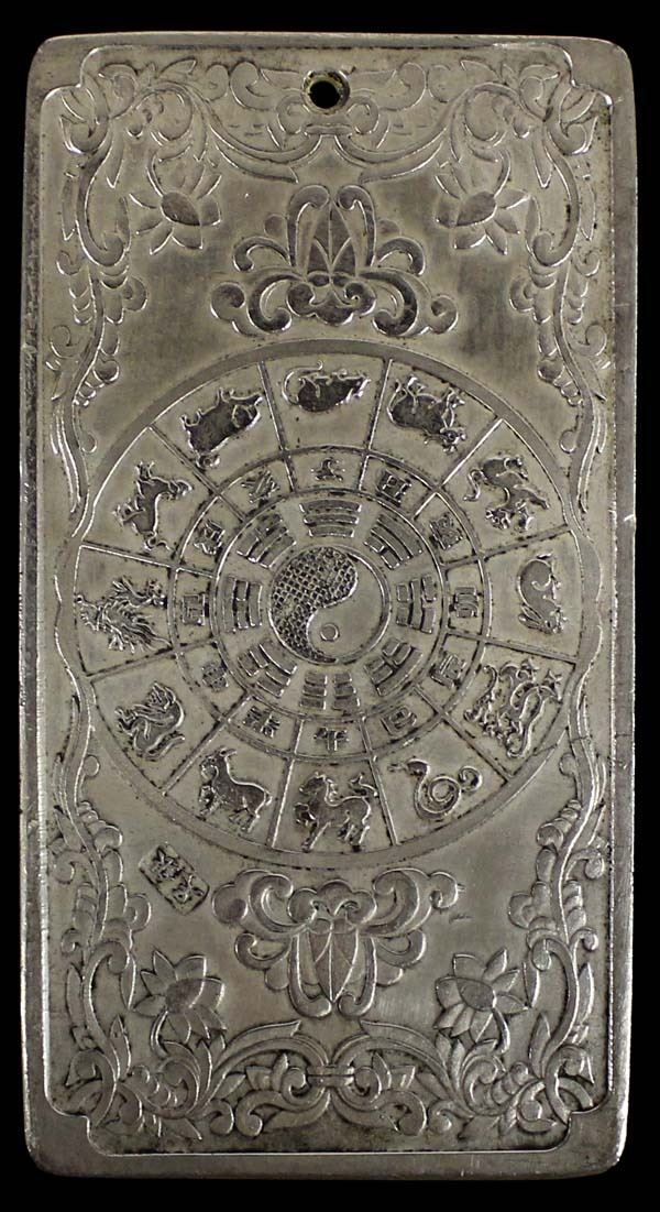 Vintage Chinese Calendar Year of the Rooster Silver Bullion Bar, .999, beautifully cast with a rooster on the front and the Chinese horoscope wheel of twelve zodiac symbols on the reverse, along with the Chinese stamp for silver weighs approximately 135g. Post 1940's, measures 3.75''L x 2"W x 1/8''Deep