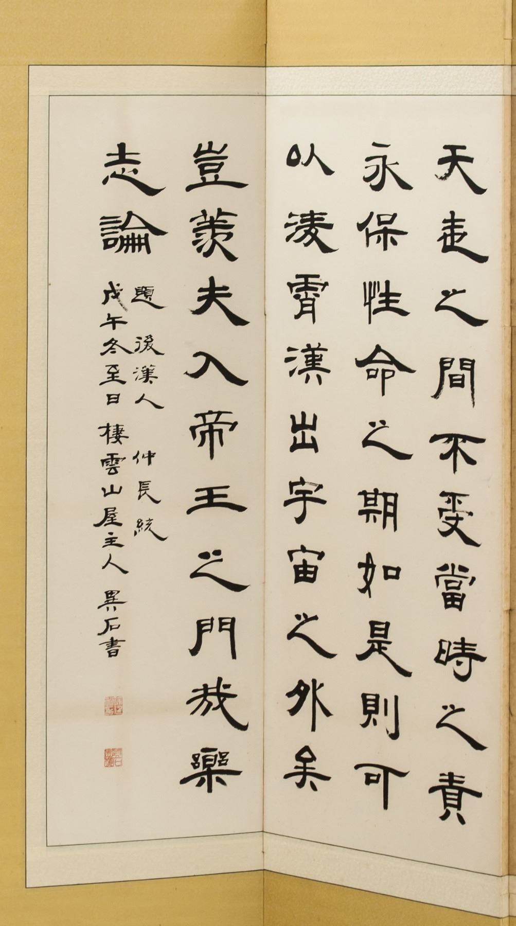 Ink on paper, screen divider. Featuring Chinese calligraphy in clerical script. Inscribed with three seals. Each panel: 169 x 41 cm, total of 8 panels