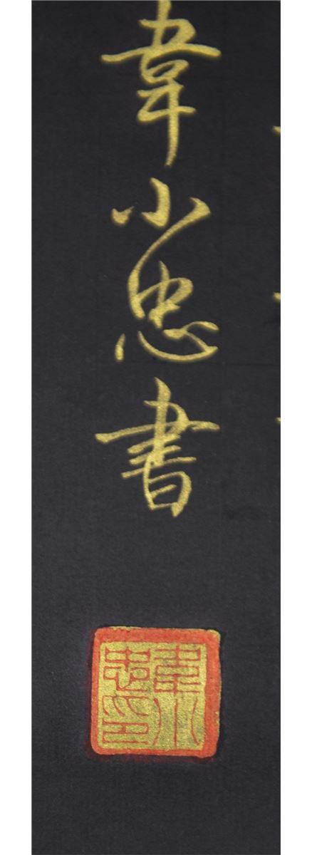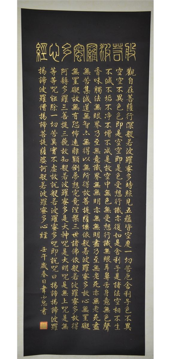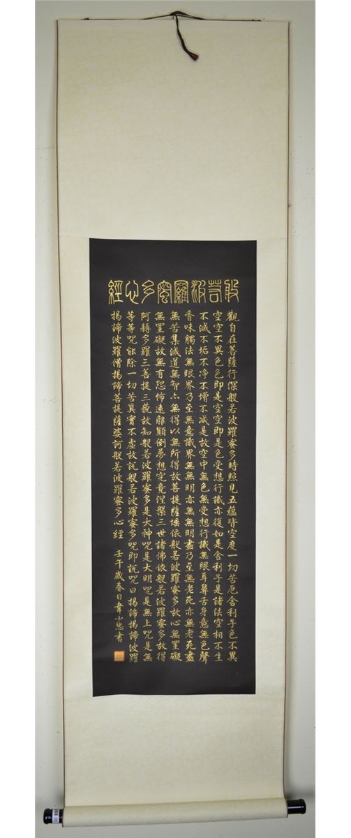 Buddhist prayer script written in gold ink. Hanging scroll format. Sealed by artist. Provenance: Eastern Shen Collection, Toronto. H: 90 cm x W: 43 cm