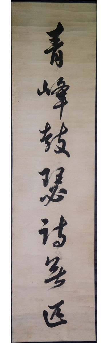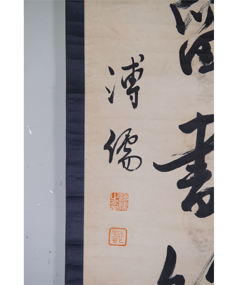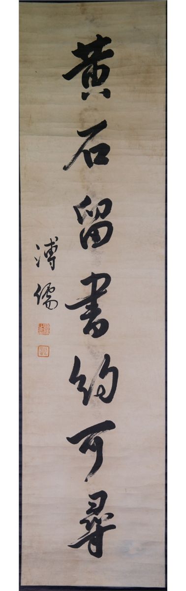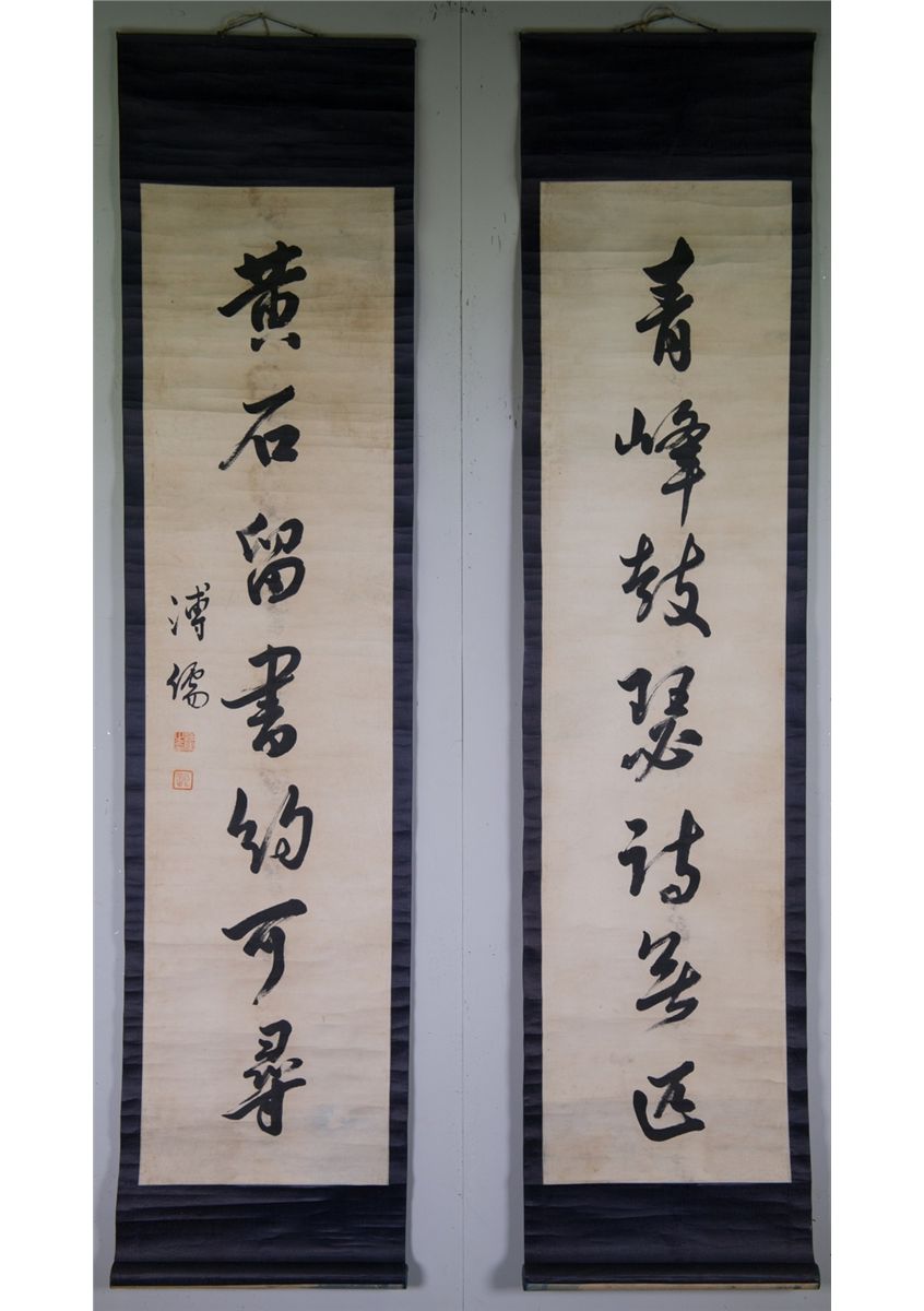 Calligraphy couplet; Chinese ink on paper; hanging scroll; signed by Puru (1895-1963) and inscribed with two artist seals; 131 cm x 33 cm