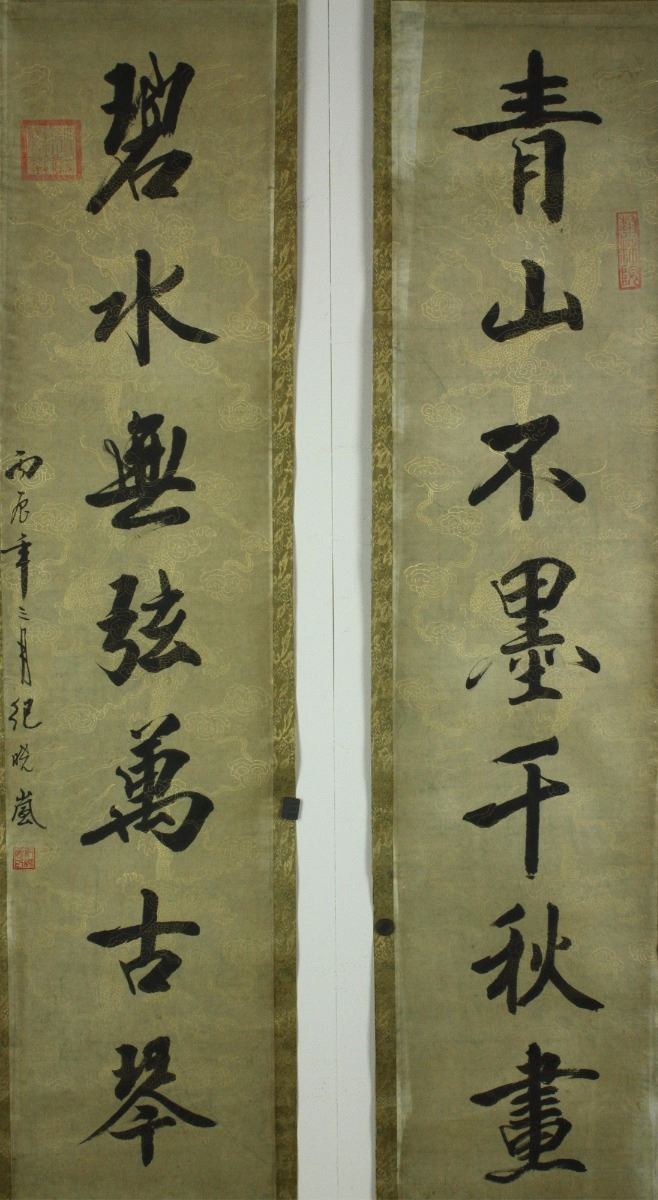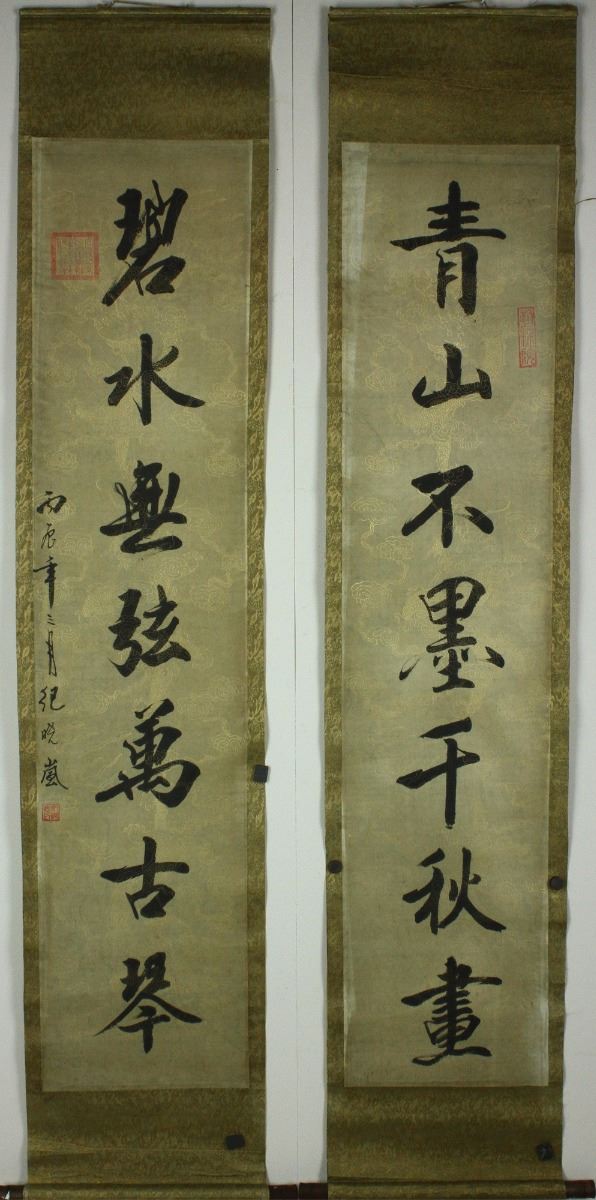 Calligraphy couplet; lithograph on paper; two hanging scrolls; signed and inscribed with two artist seals; 138 cm x 32 cm each