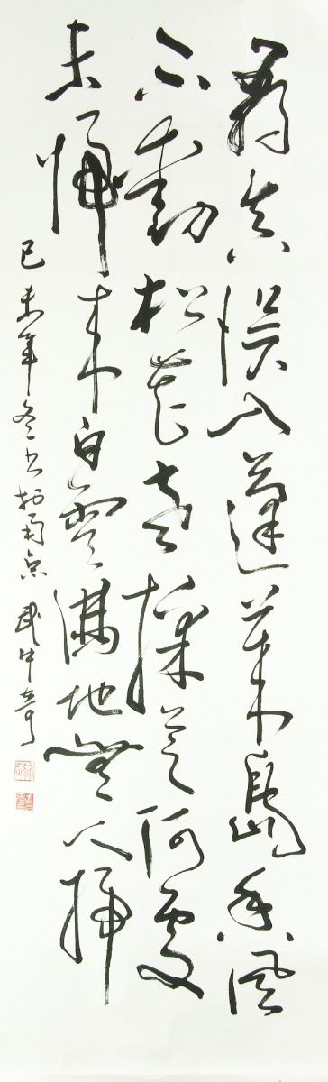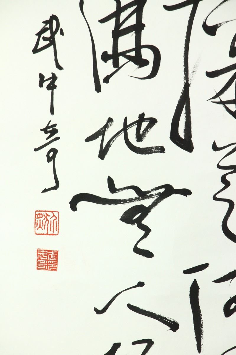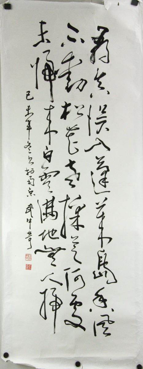 Chinese calligraphy; Chinese ink on paper; signed Wu Zhongqi and inscribed with two artist seals; 139 cm x 49 cm