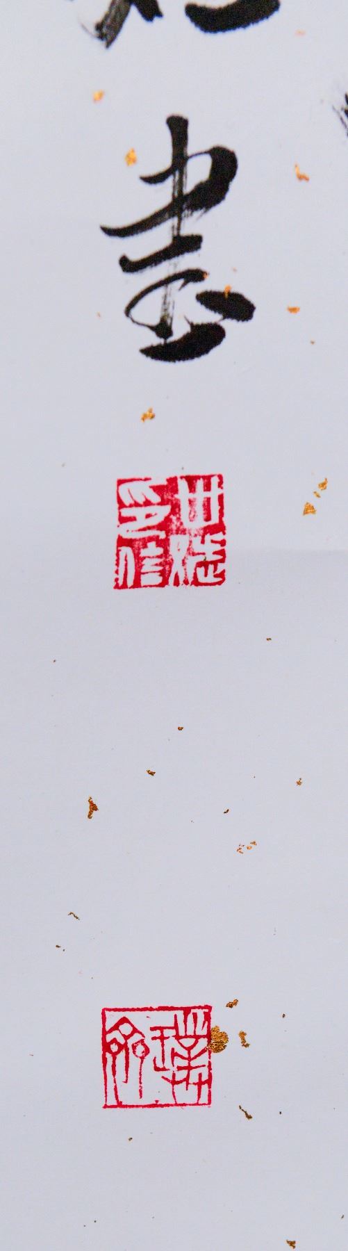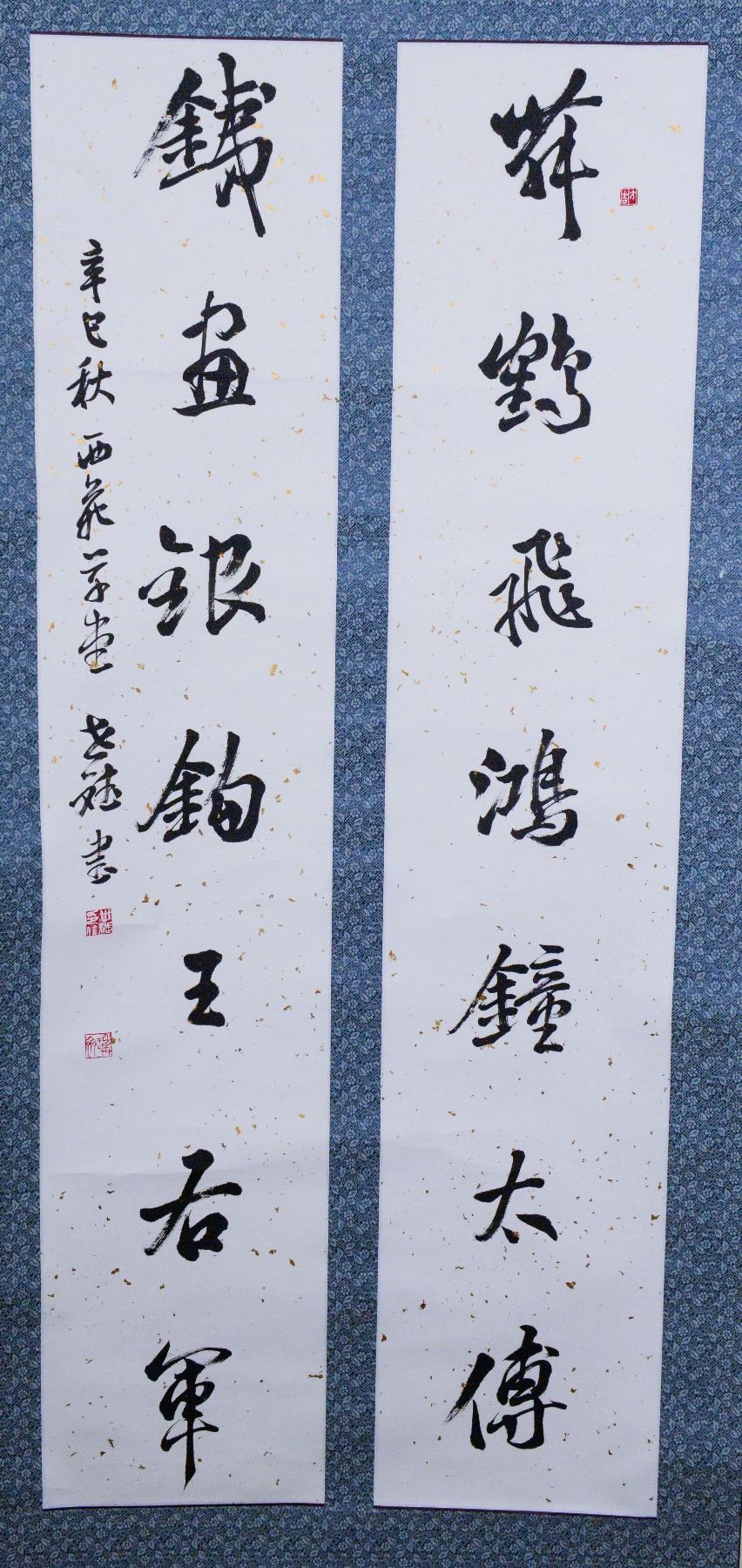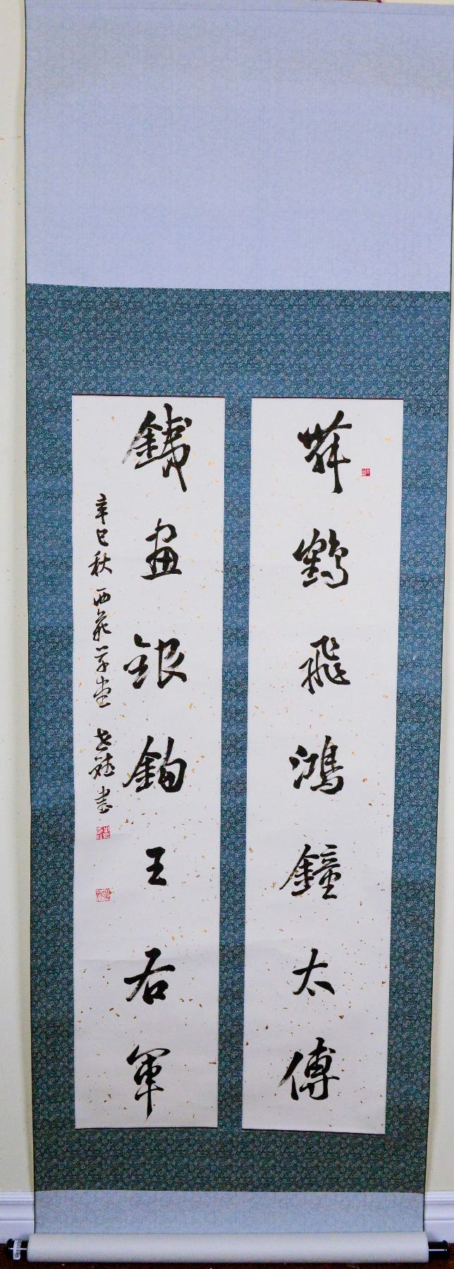 Ink on paper, hanging scroll. Featuring a calligraphy couplet. Signed by artist, inscribed with three artist red seals. 233 x 72 cm.