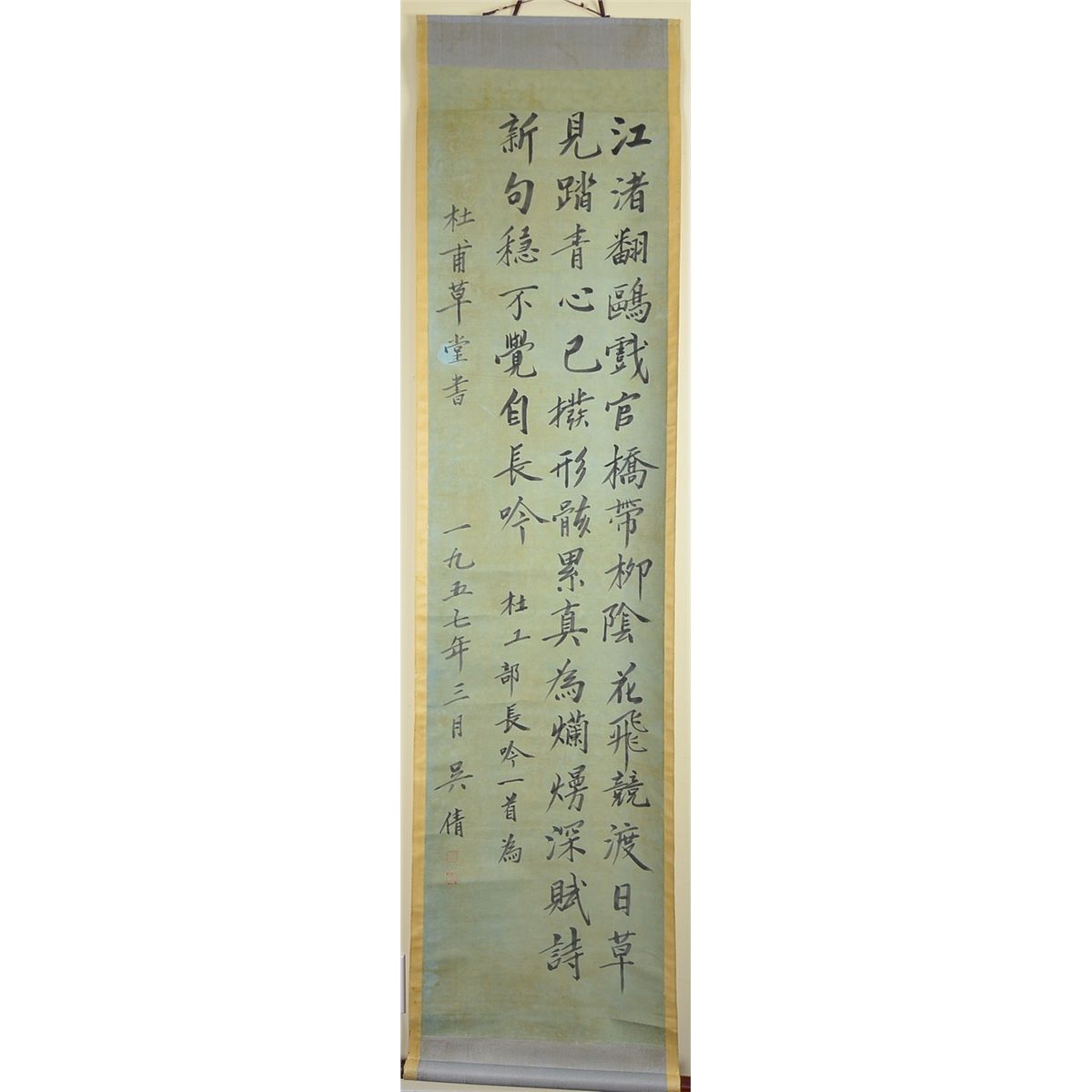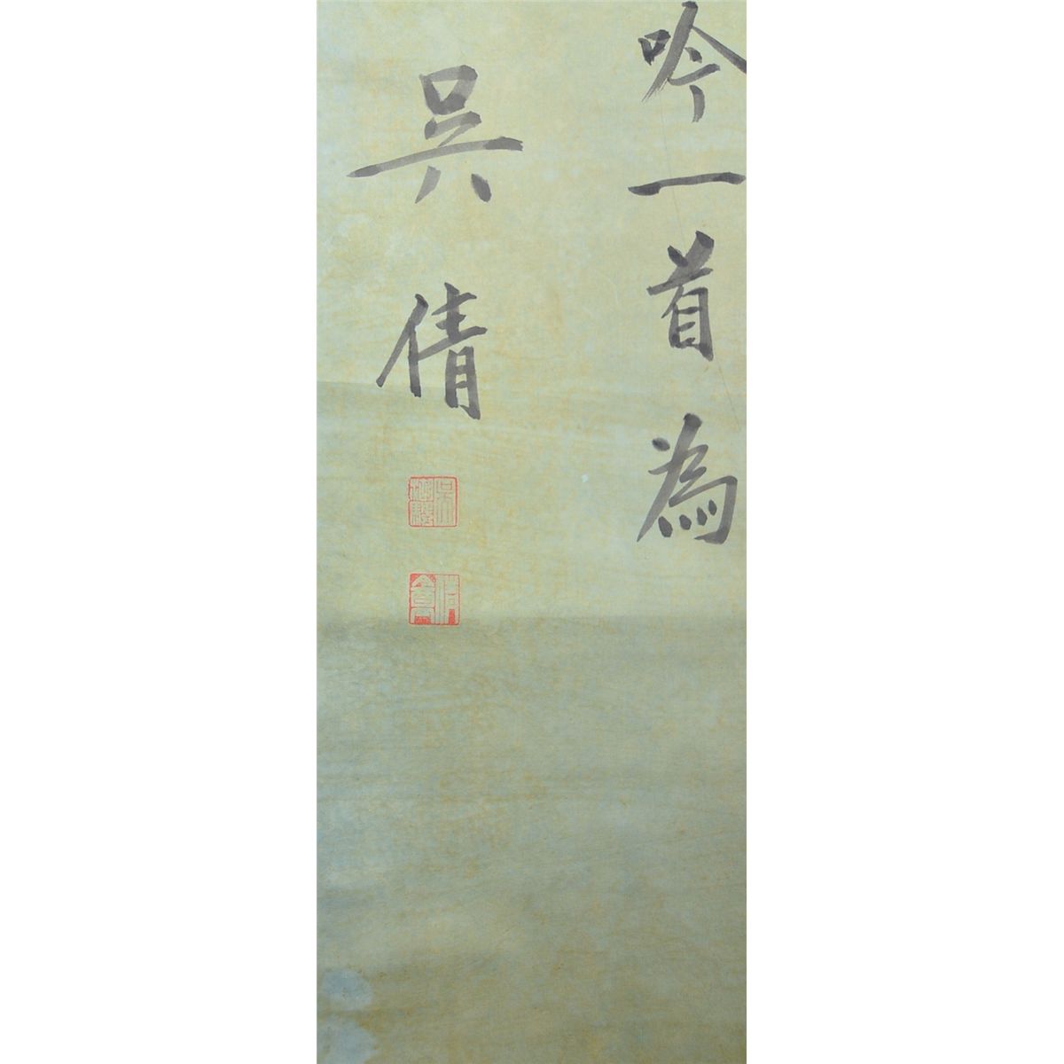 Chinese calligraphy, ink and colour on paper; signed Wu Hu Fan (1894-1968); inscribed and signed with one artist seal; 180 cm x 45 cm
