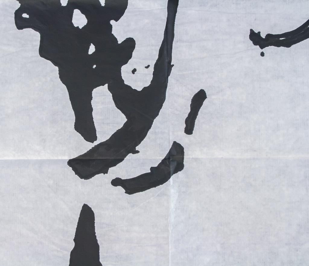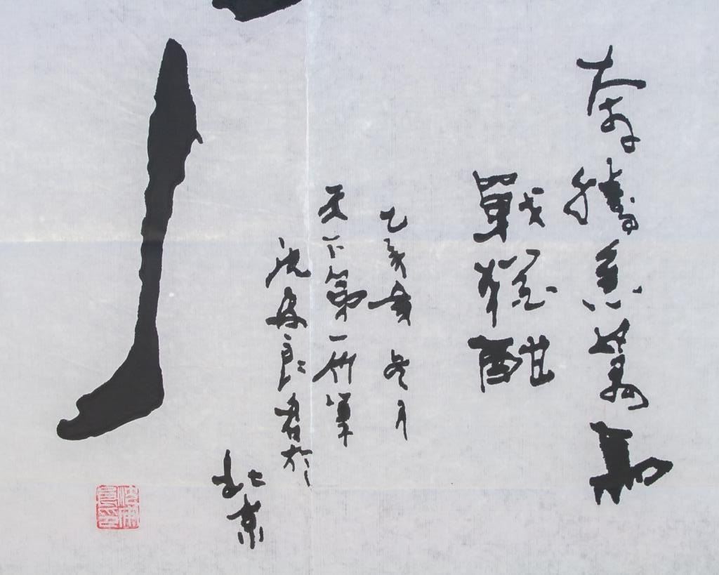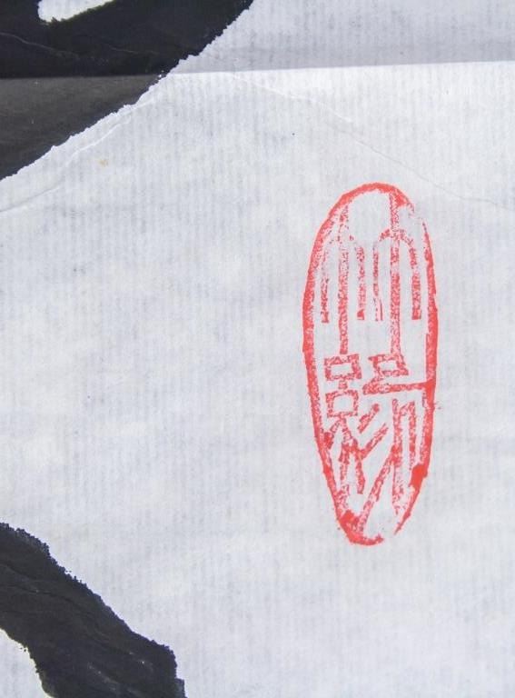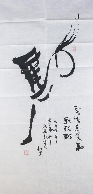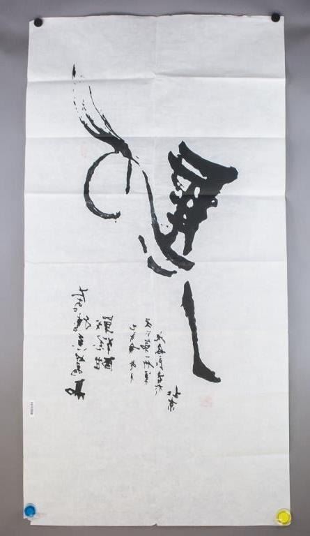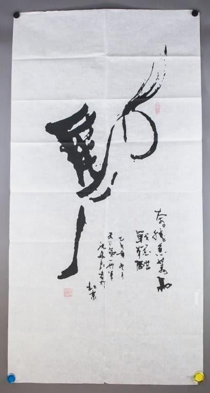 Chinese ink on paper. Featuring calligraphy of the character for "horse" as a prancing horse. Inscribed with two seals. One seal inscribed with LIN YUAN. 136 x 69 cm.
