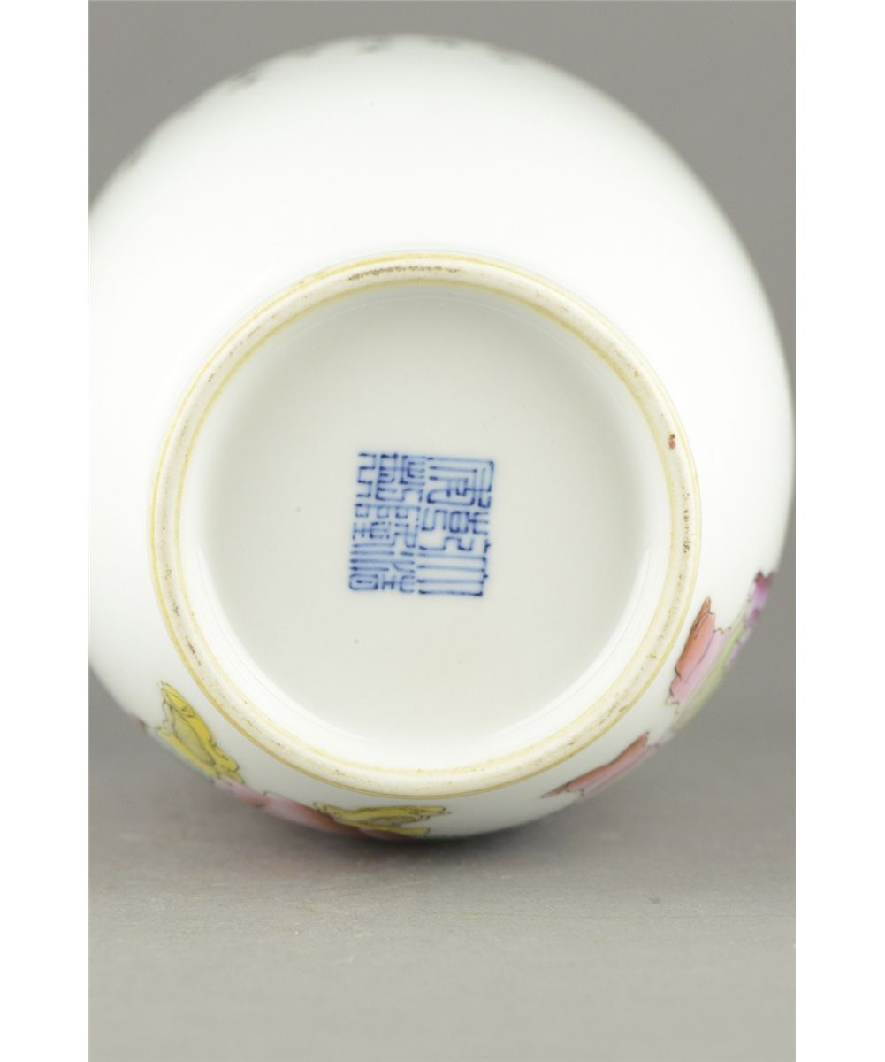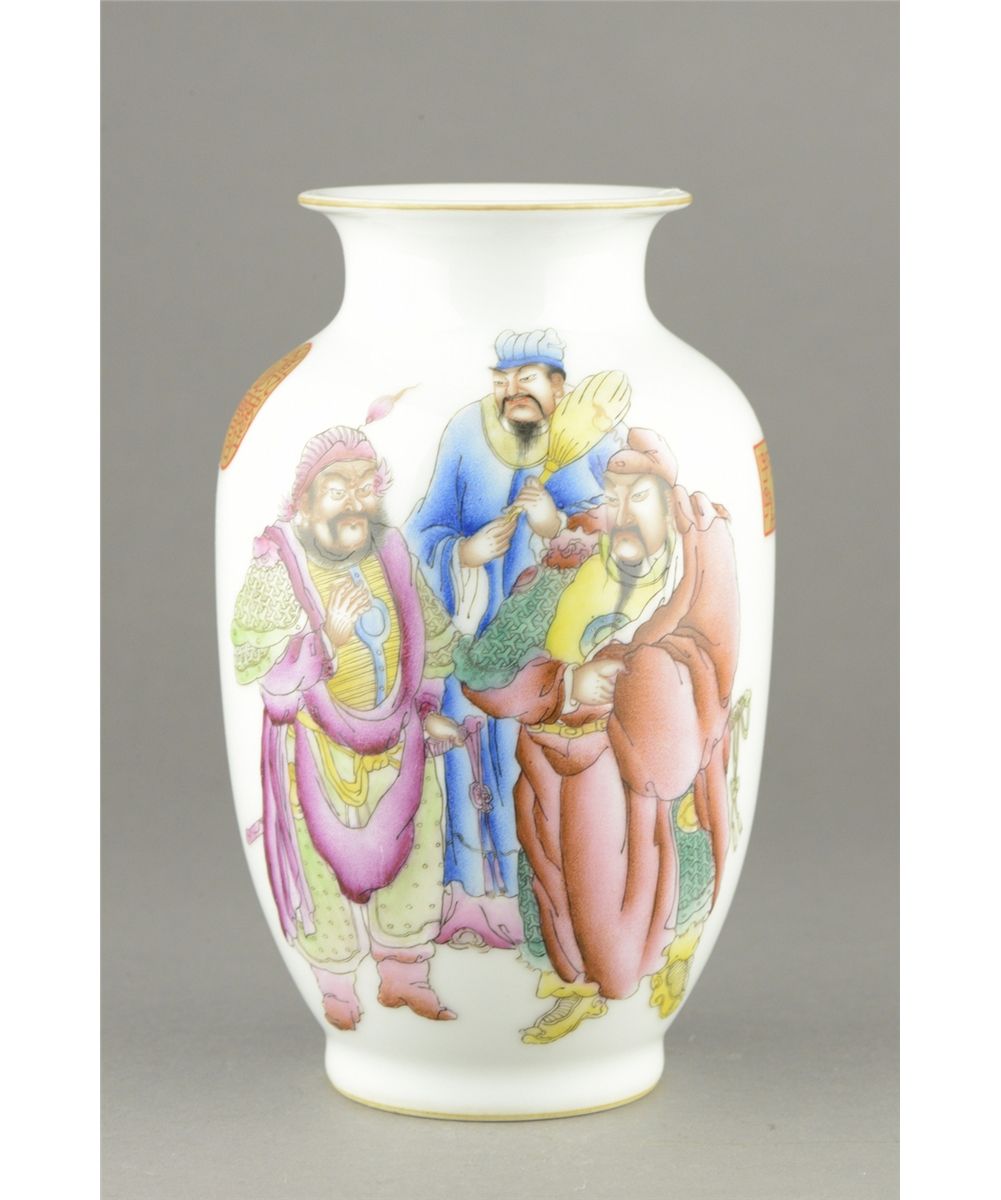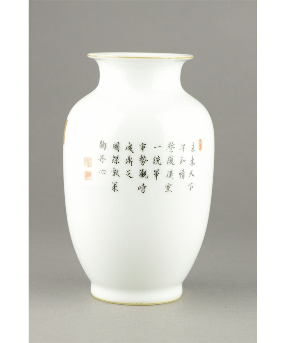 Chinese porcelain vase, brightly painted with three generals on front and back inscribed poetry about war. With three artist red seals. Six characters Qianlong reign mark on base. H: 18 cm, W: 11 cm, 516 grams. Provenance: T. Ng Collection Toronto.