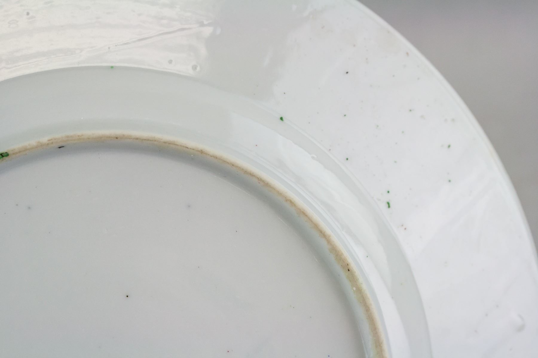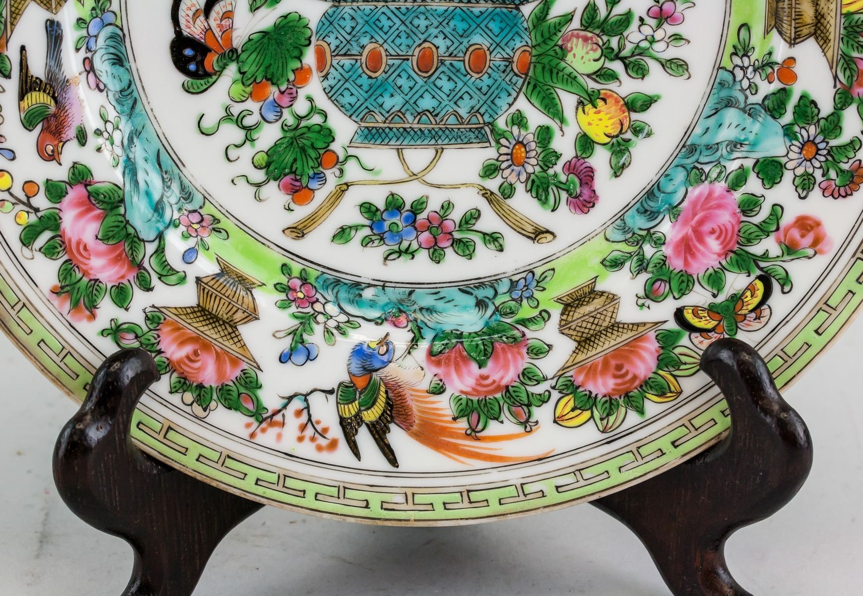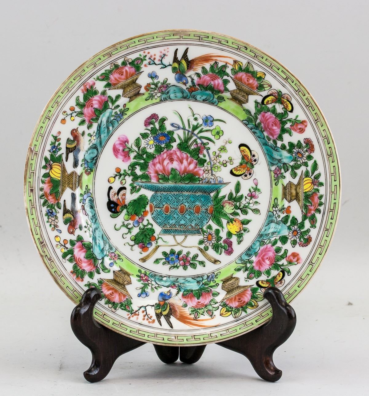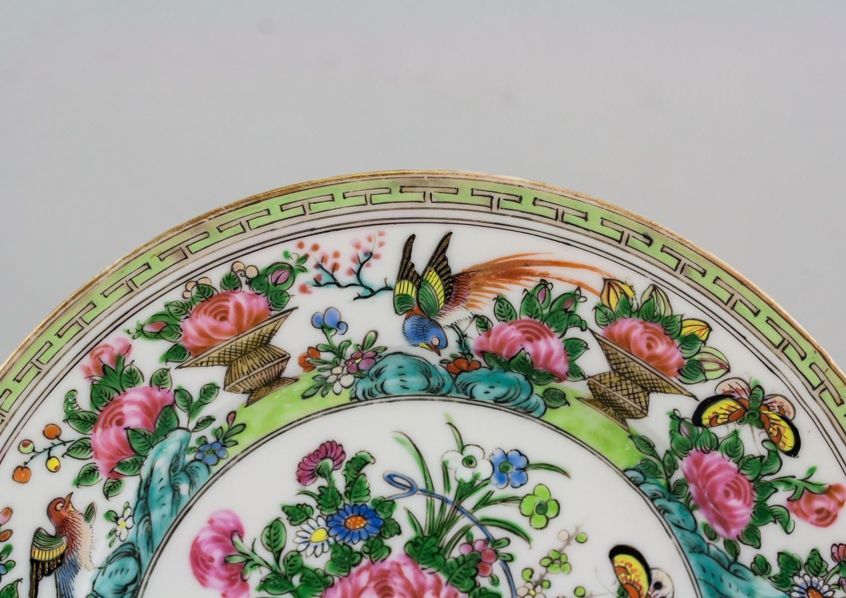 Chinese Canton enamel porcelain plate. Of round edge, tapering to bottom, supported on short foot rim. Painted with various flowers, butterflies and birds. 3 x 21 cm, 333 grams