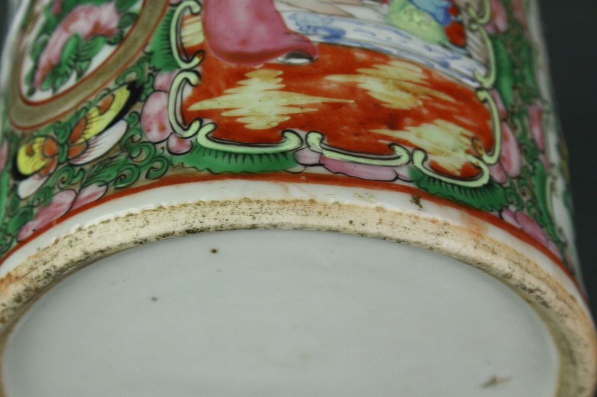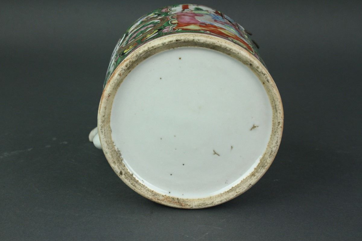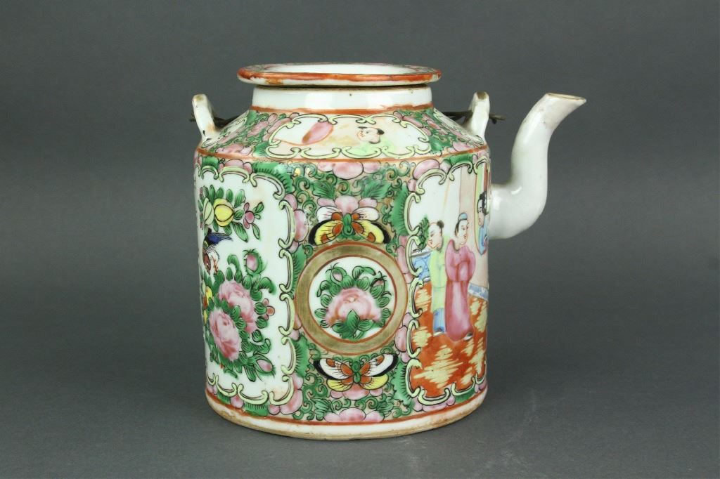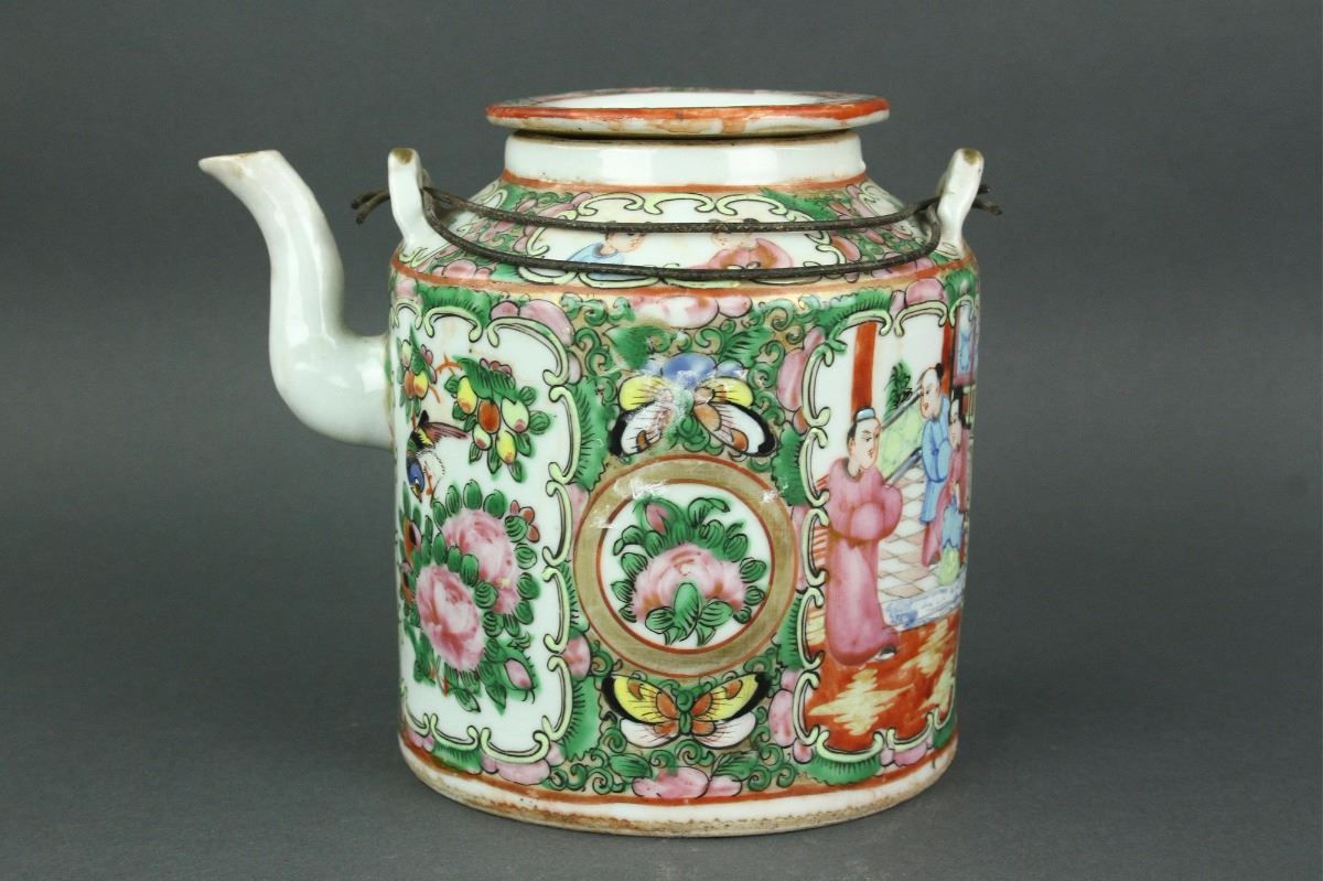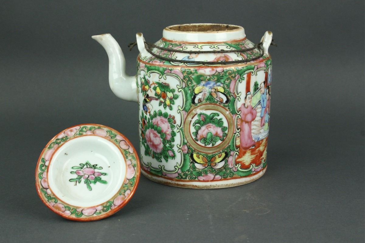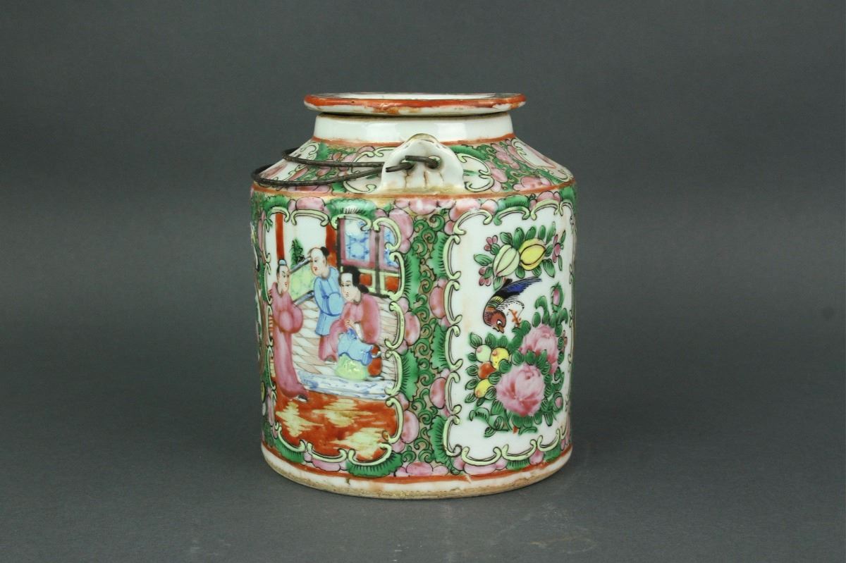 Chinese Canton rose medallion porcelain teapot with cover; of cylindrical body with curved spout and metal handles; enameled with panels of figural and floral scenes; H: 14 cm, D: 11 cm, 696 grams