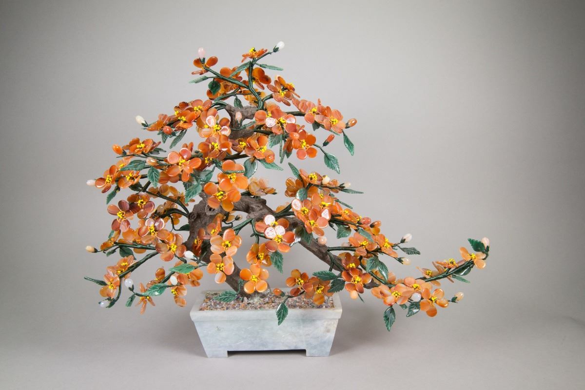Chinese carnelian agate and jadeite carved tree; unusual and large Chinese carnelian agate and moss agate flowering tree; set into a rectangular jadeite carved with floral relief and filled with crushed semi-precious stones; H: 40 cm, W: 53 cm, 3389 grams