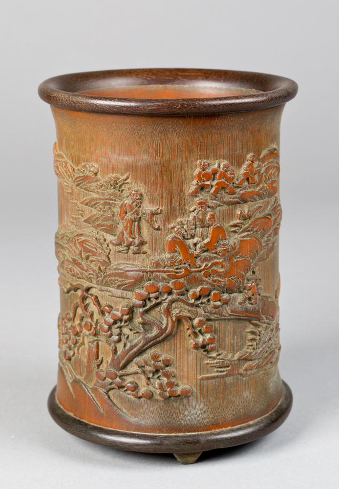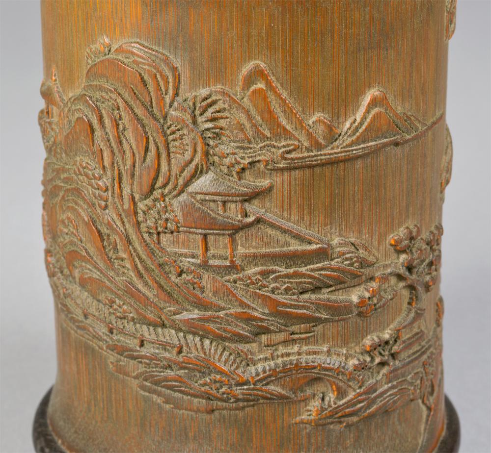 Finely carved to depict numerous figures in a mountain landscape with village nearby, resting on a stand with three feet. 6 & 5/8" H x 4 & 5/8" Dia., circa 20th century.
