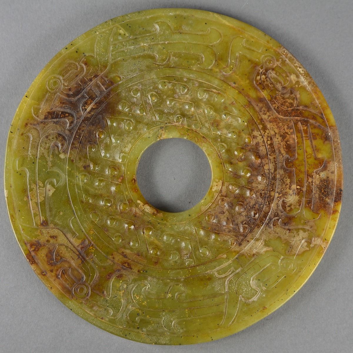 Chinese carved jade bi ritualistic disc; the stone of celadon tone with dark suffusions; D: 14 cm, 255 grams