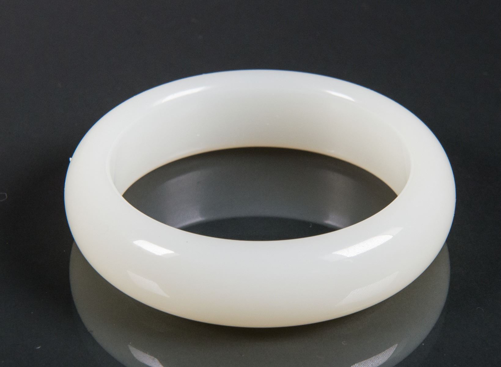 Chinese carved hardstone bangle, the stone of translucent white tone (stand not included); D: 7.75 cm, 78 grams