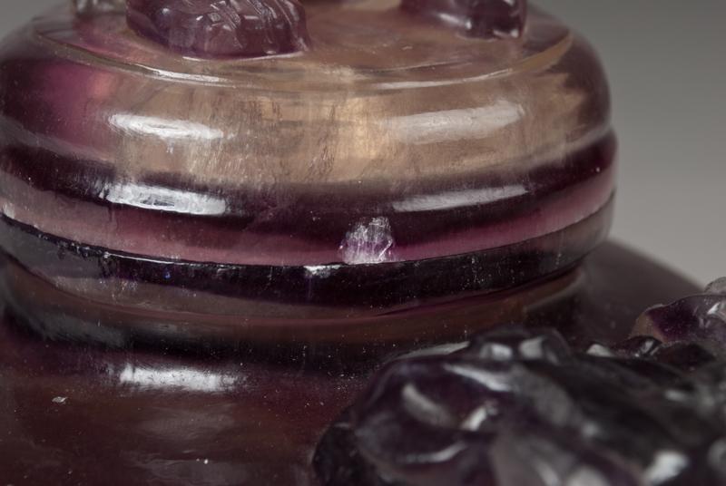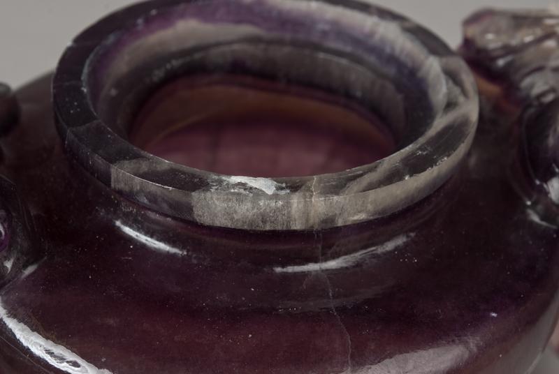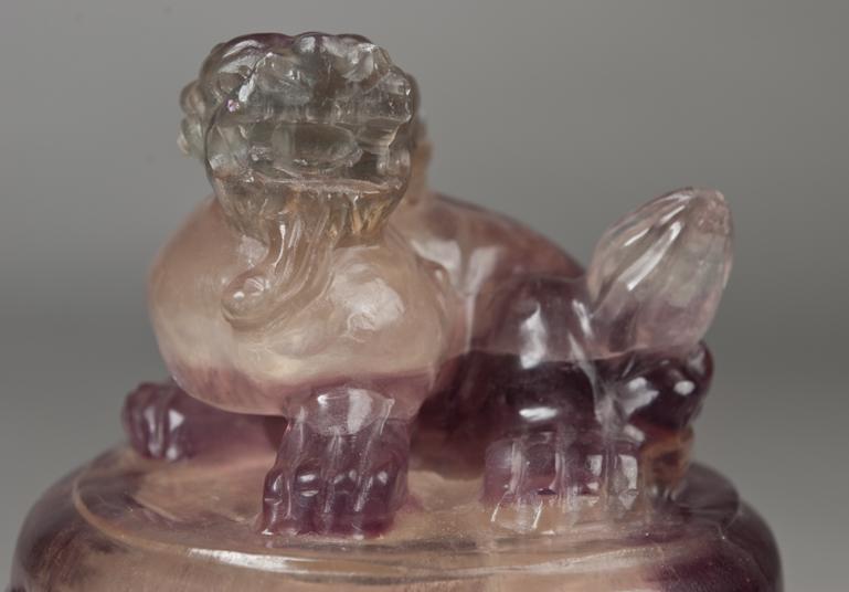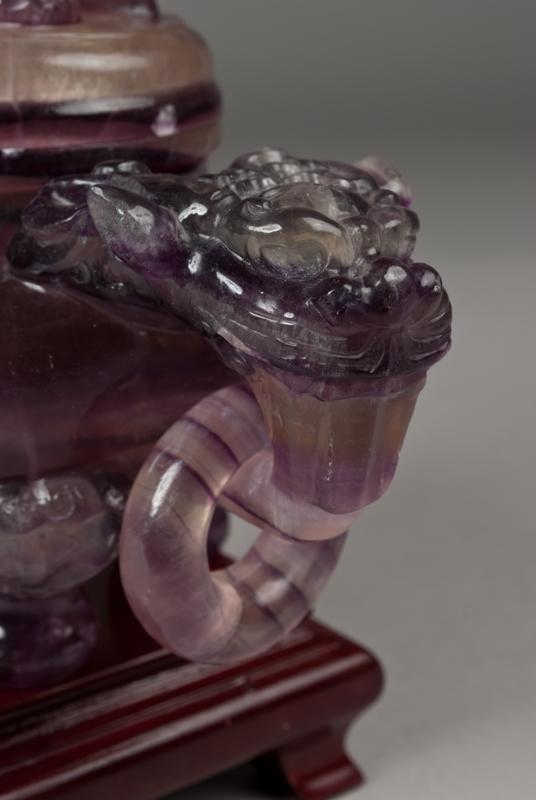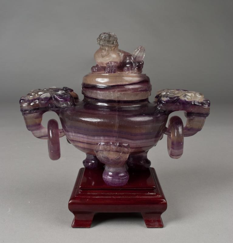 Finley carved with dragon head handles with loose rings, the top with foo dog, very heavy, 8"L x 6"H, wood stand, circa 1900