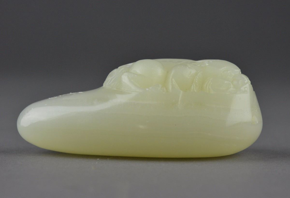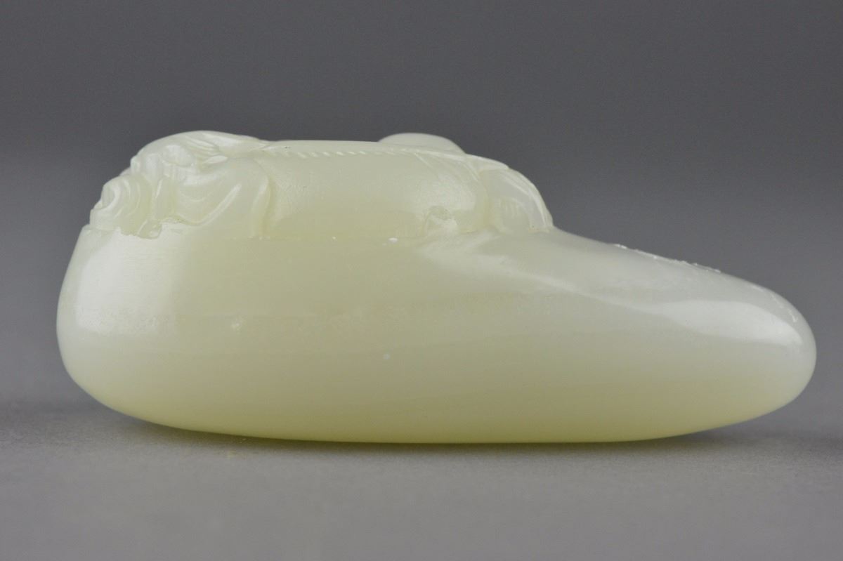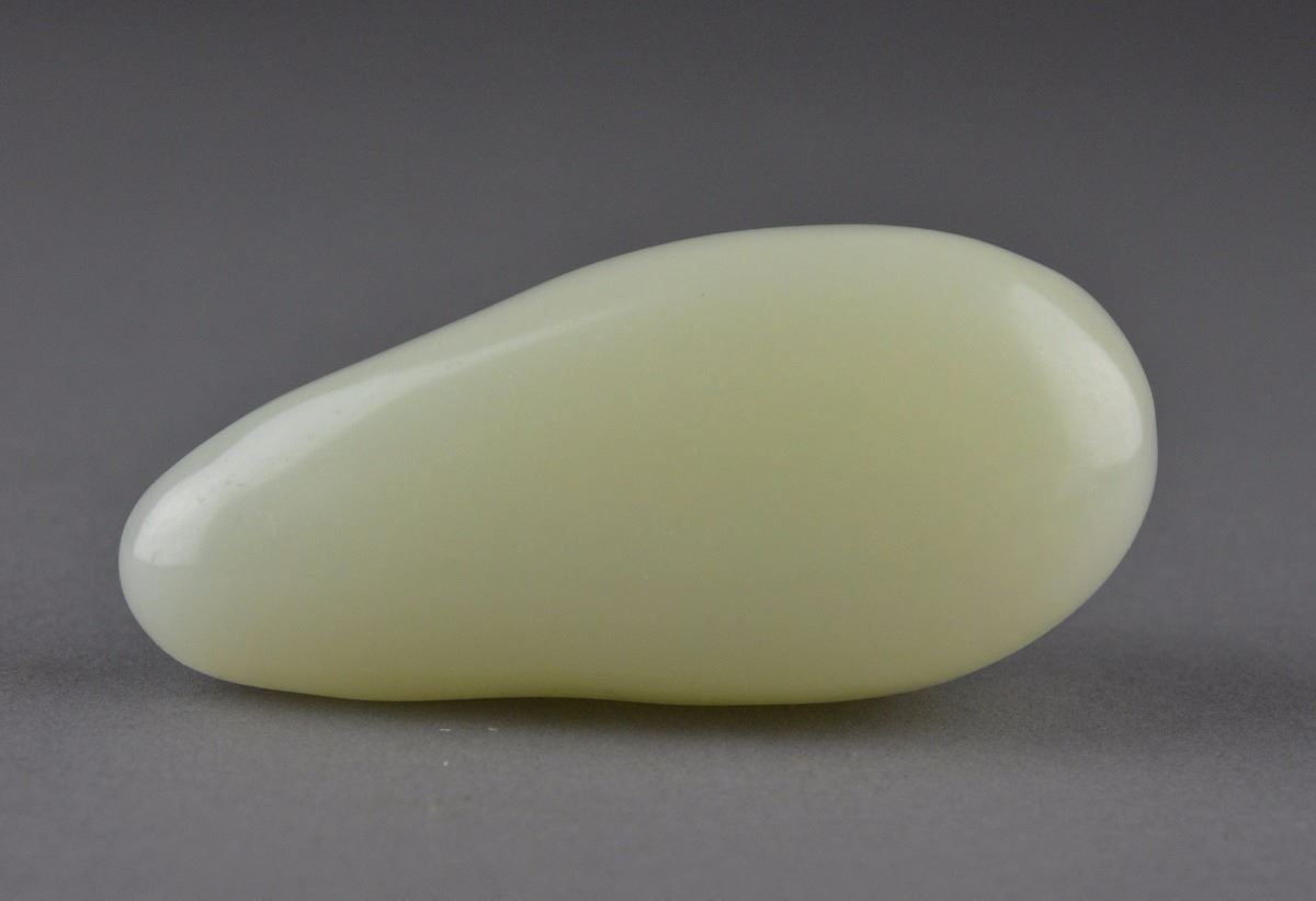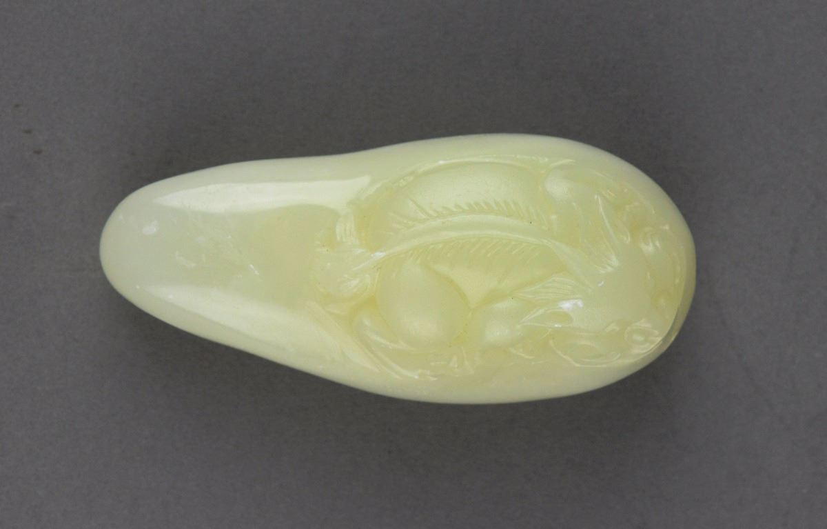 Chinese carved hardstone pebble figure; featuring Qilin in relief; the stone of translucent white tone; L: 9.5 cm, W: 4 cm, 197 grams.