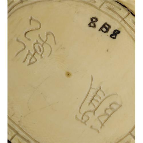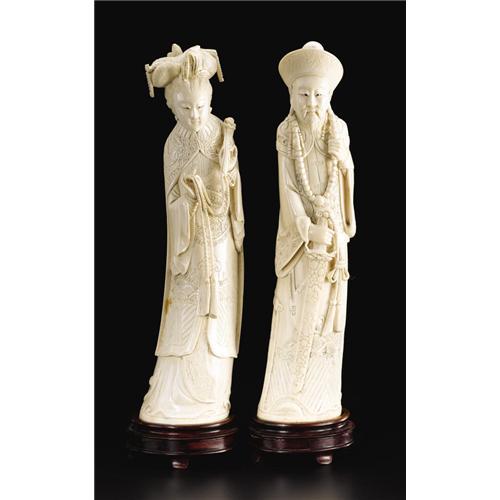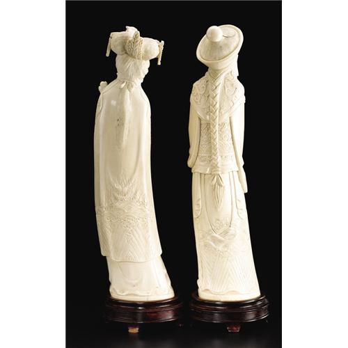 <B>Chinese Carved Ivory Emperor and Empress</B></I><BR>Unknown maker, Chinese<BR>Twentieth Century<BR>Ivory and wood<BR>Marks:each signed on base, and numbered on base and wood stand (emperor), <I>8B8 / 71.45,</B></I> (empress), <I>8B9 / 71.45</B></I><BR>11.87 inches high (each)<BR>Chinese carved ivory emperor and empress figures; he holds prayer beads in one hand, the other resting on his sword; she is garbed in phoenix robes, holding a scepter; both with elaborate head dresses, on carved wood stands.<BR>Provenance: Bessie Heard, McKinney, TX; Bessie Heard Trust <B>Condition Report:</B> Normal signs of wear as appropriate with age; the emperor with a .75 x .75 inch plaug in the top of his head dress, and the empress with .5 x .37 inch plug in the top of her hair<BR><BR><b>Shipping:</b> Requires 3rd Party Shipping (<a target="_blank" href="http://www.heritageauctions.com/common/shipping.php">view shipping information</a>)