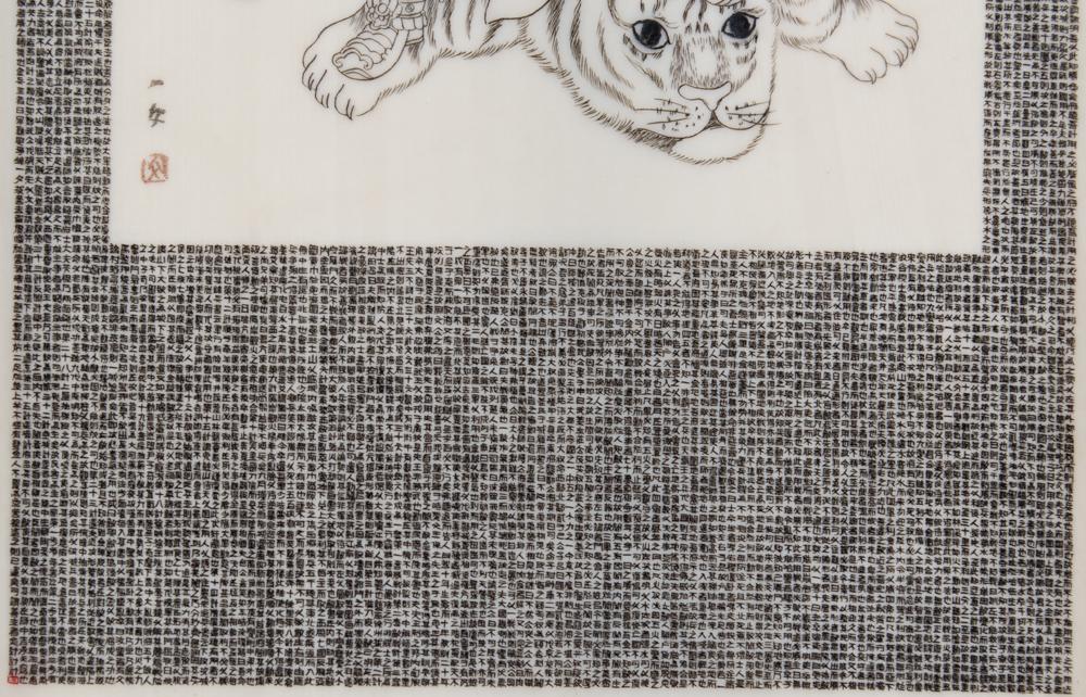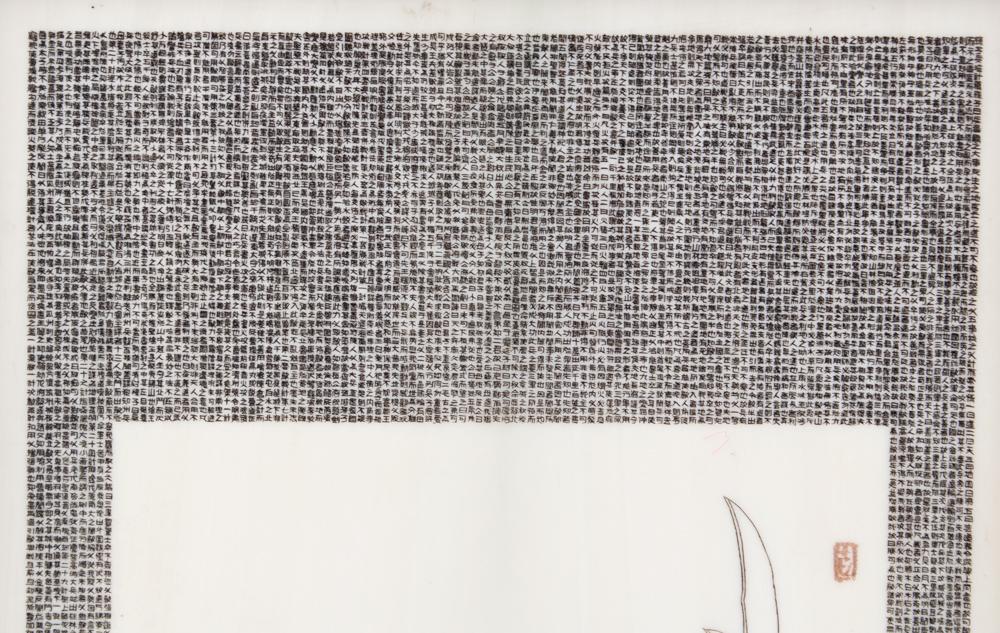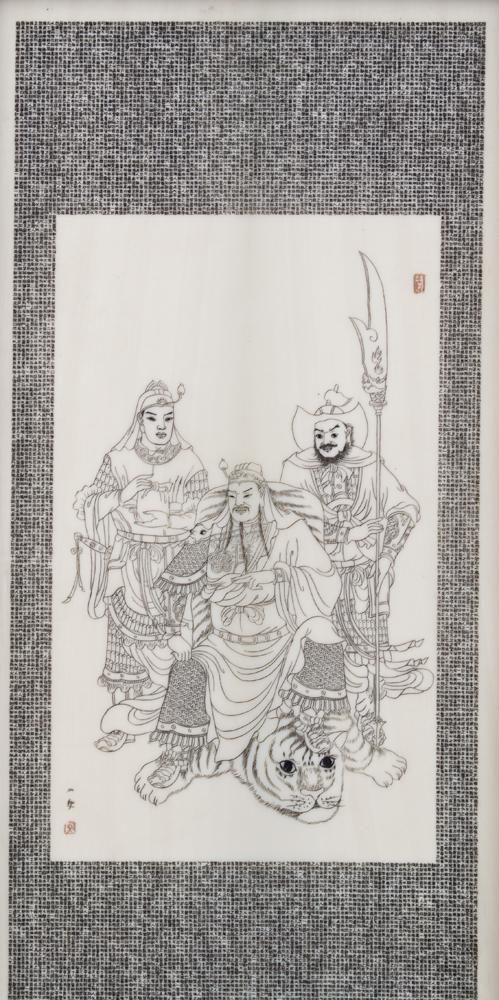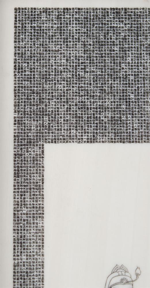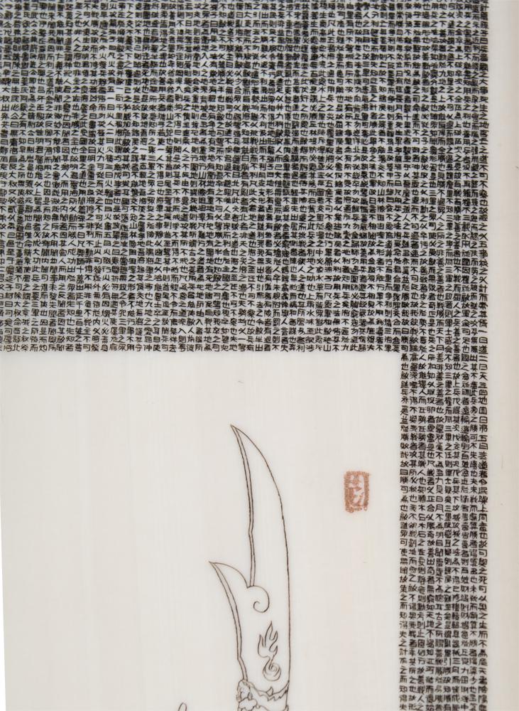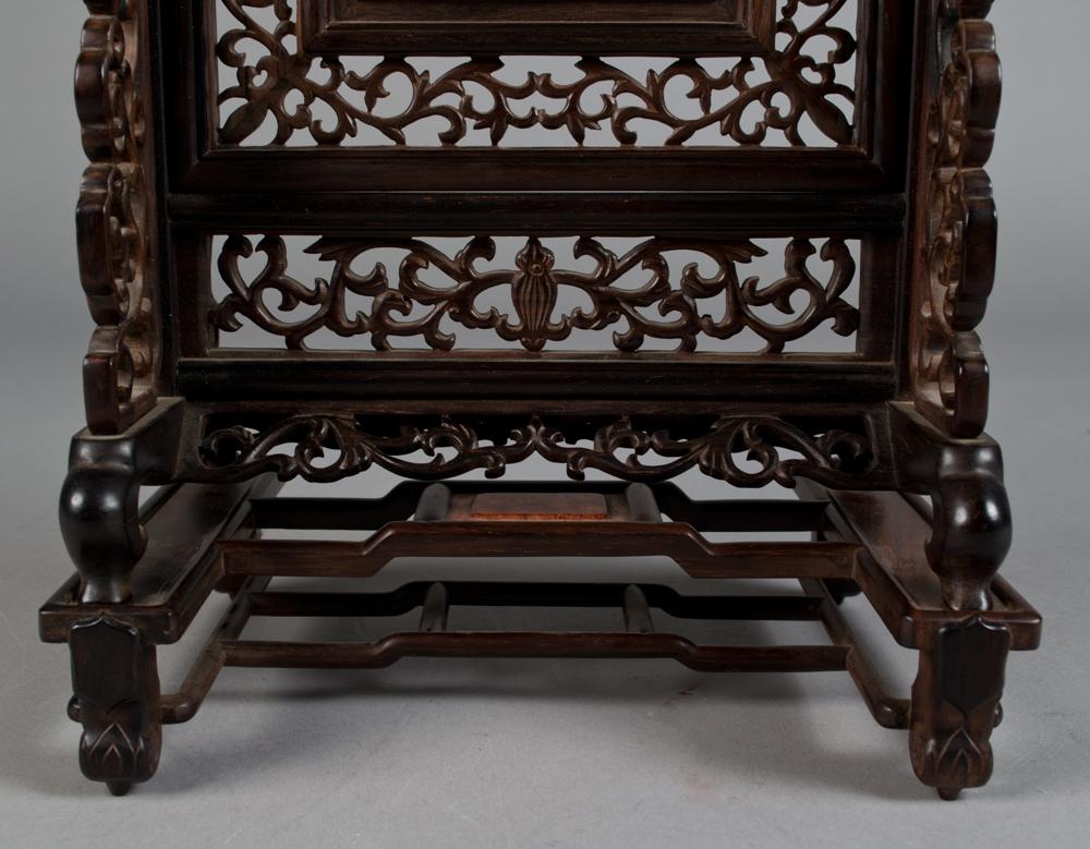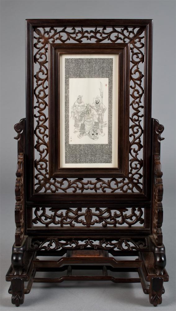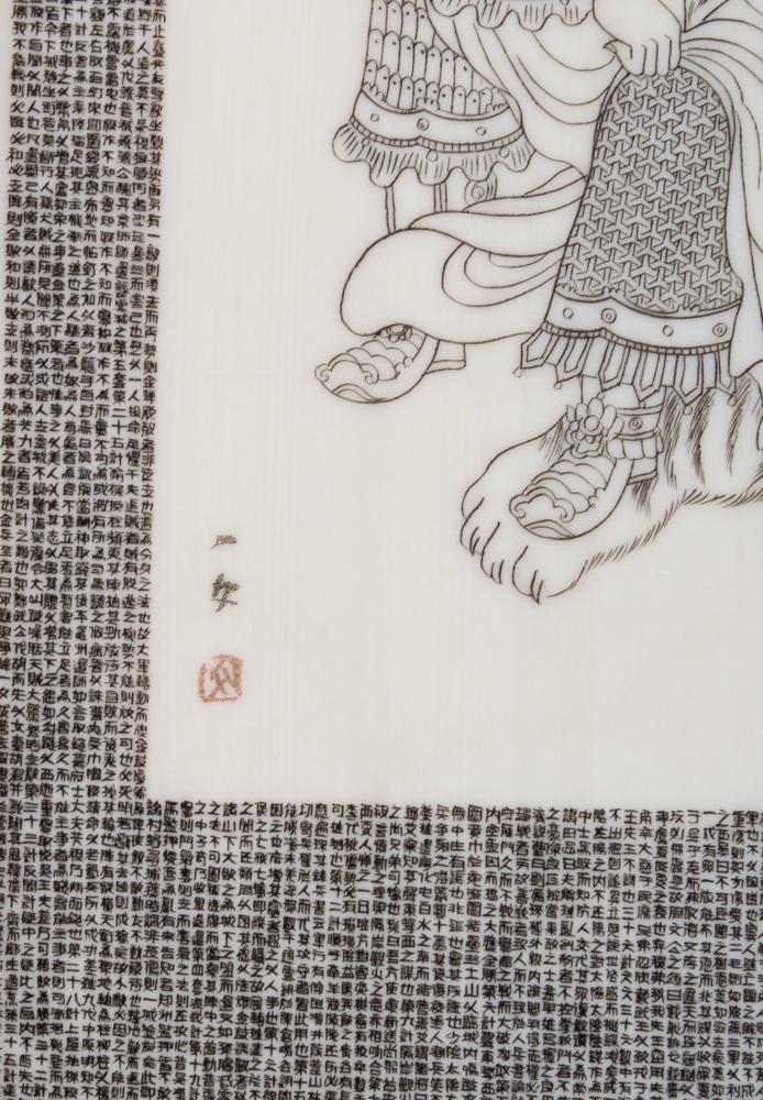 Raised on inlaid with burl wood two part rosewood stand, over fifteen thousand characters in miniscule carved to depict the "Art of War" and three warriors, ivory screen measures 6" H x 3.125" W. Total height is 14" H x 7.5" W, in fitted silk box.