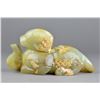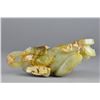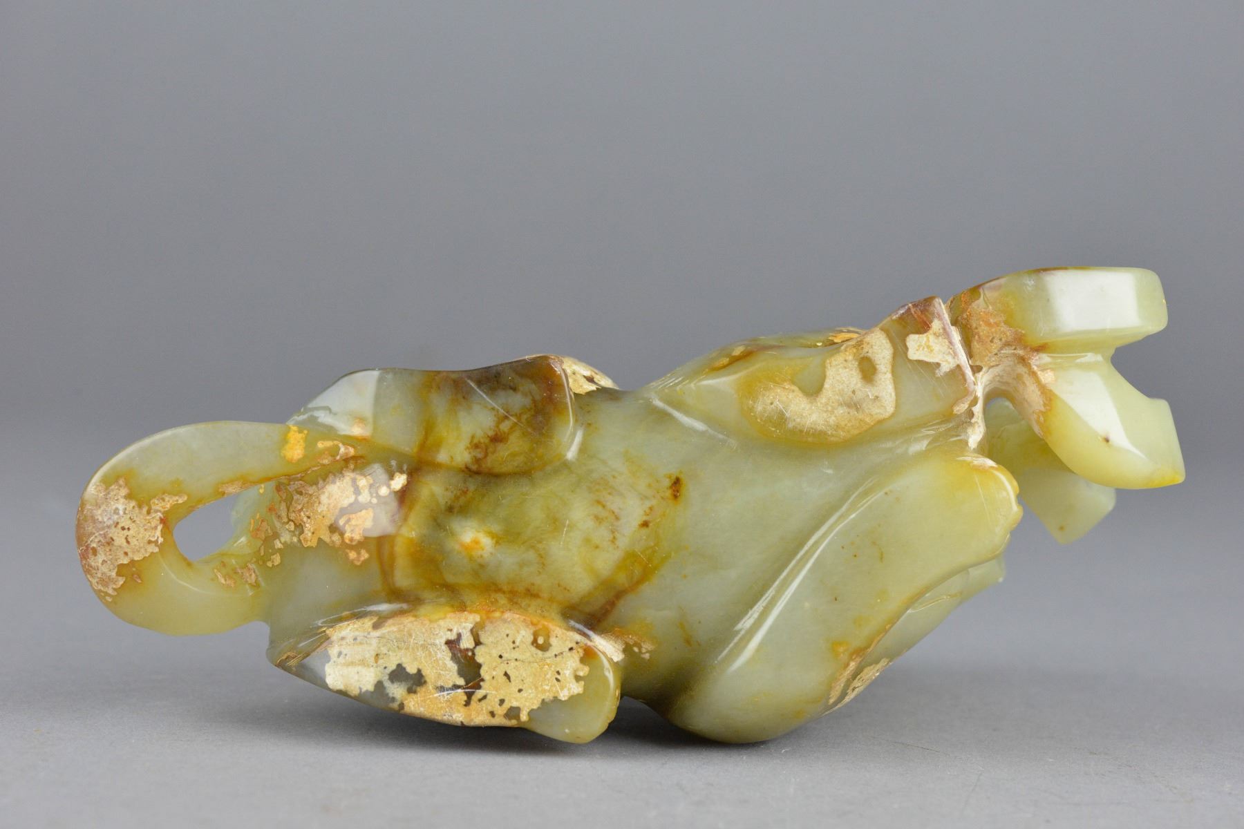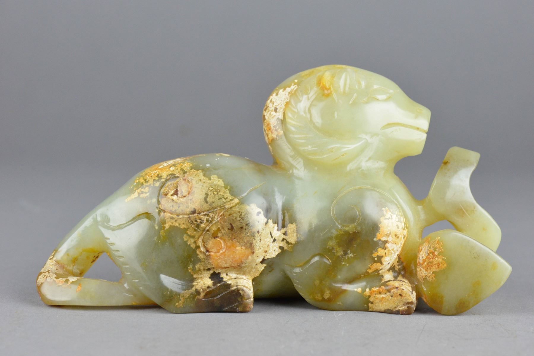 Chinese carved jade figure; featuring ram in recumbent pose; the stone of light celadon tone with calcification; L: 19.5 cm, W: 6 cm, H: 9.5 cm, 1137 grams