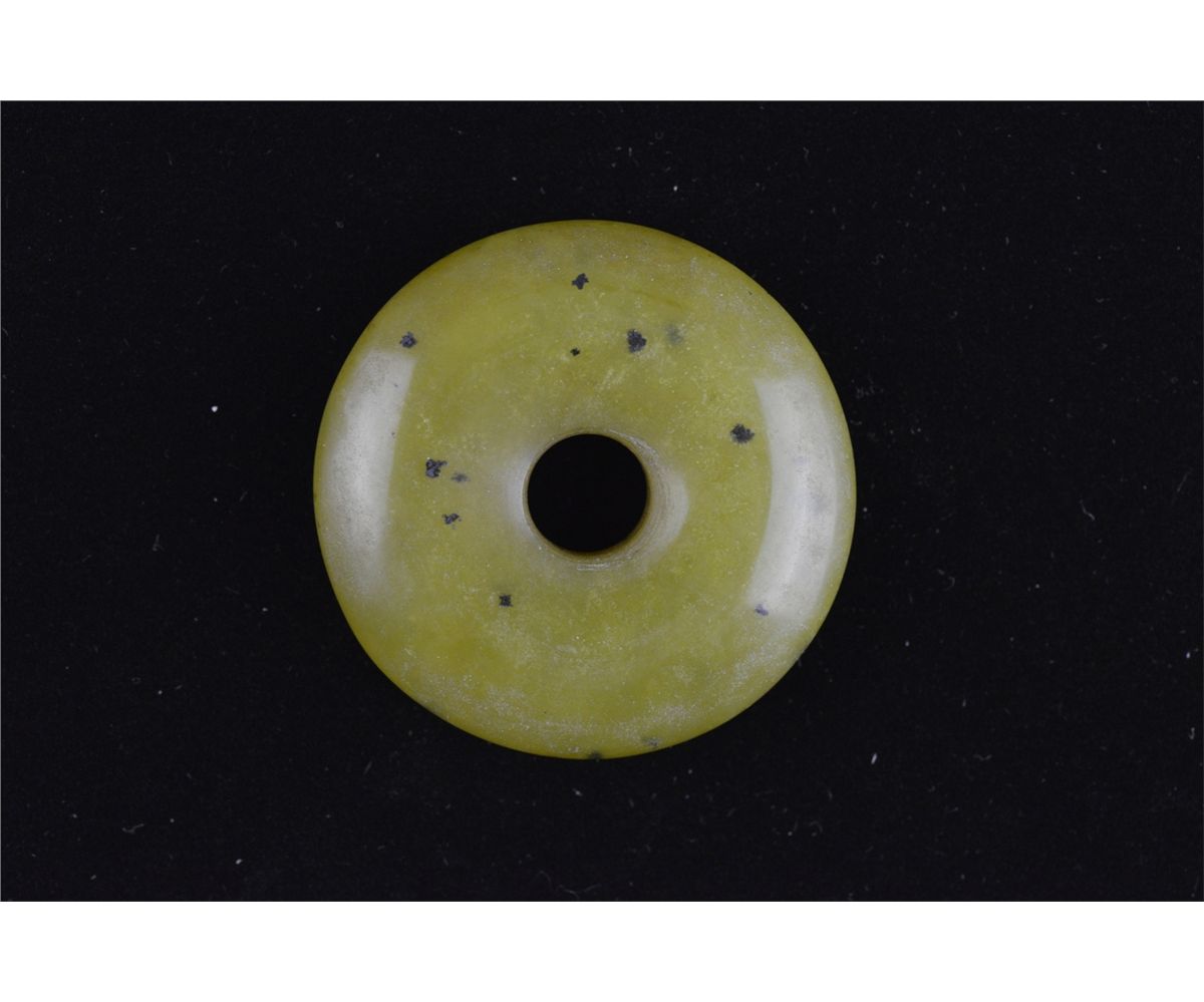 Chinese caved jade circular pendant; the stone of translucent olive green tone; D: 5 cm, 42 grams