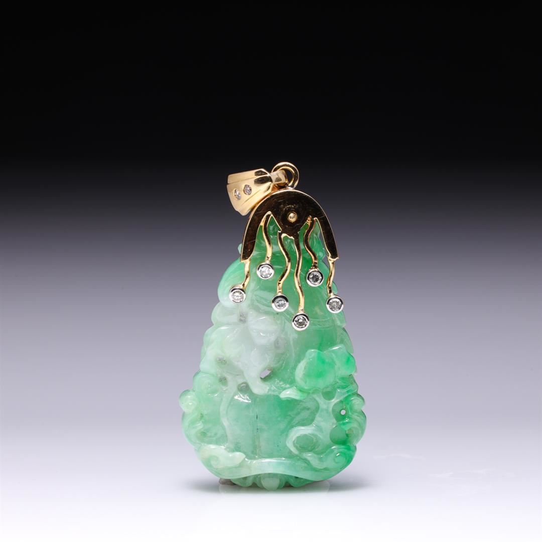 Chinese Carved Jadeite Pendant with 18K Yellow Gold & Diamond Mount containing eight round diamonds weighing approximately 0.15 cts. Total weight is 16.6 gm. Estimated retail value $3,200.