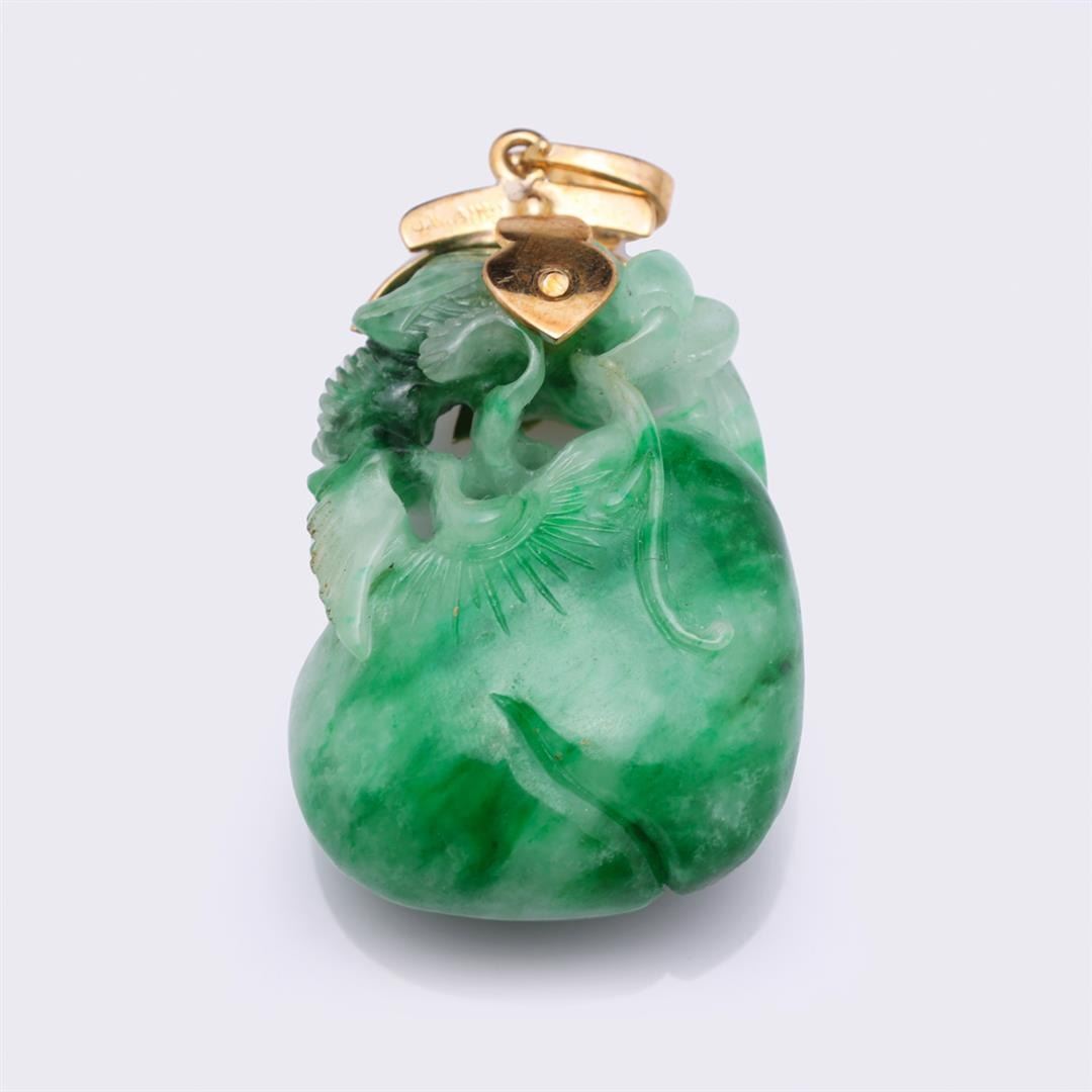 Finely carved Chinese bright green jadeite toggle in the form of a peach with leaves; later mounted in 18K yellow gold with diamonds, marked 18k with hallmark; gross weight 34g, L 2 inches (approx.)
