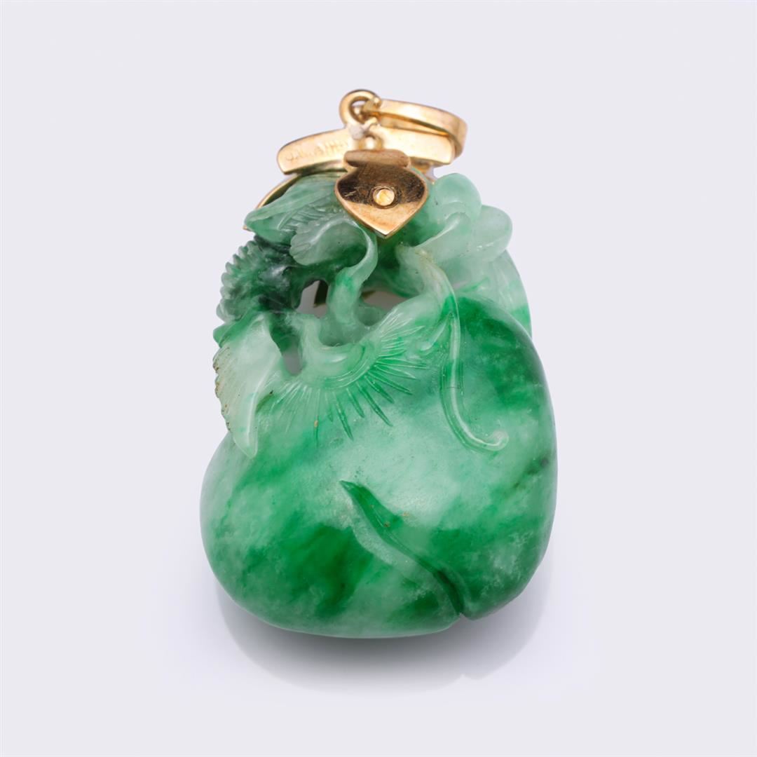 Chinese Carved Jadeite Toggle Mounted in 18K Yellow Gold. Containing fourteen round diamonds weighing approximately 0.10 cts. Total weight of 34.6 gm. Estimated retail value $2,800.