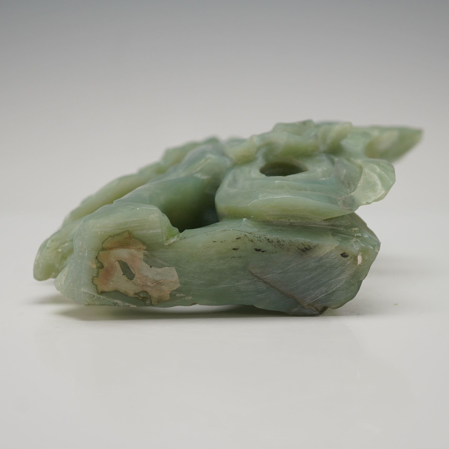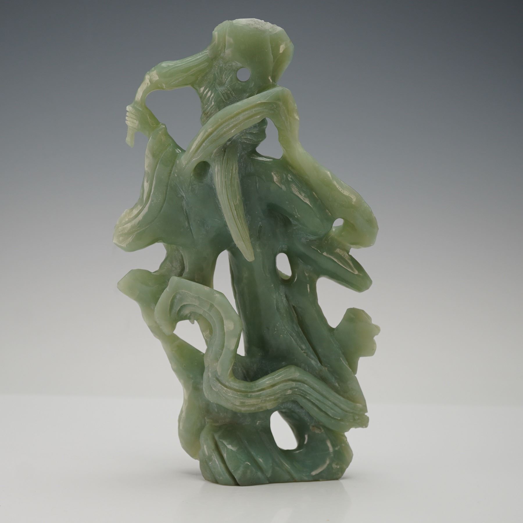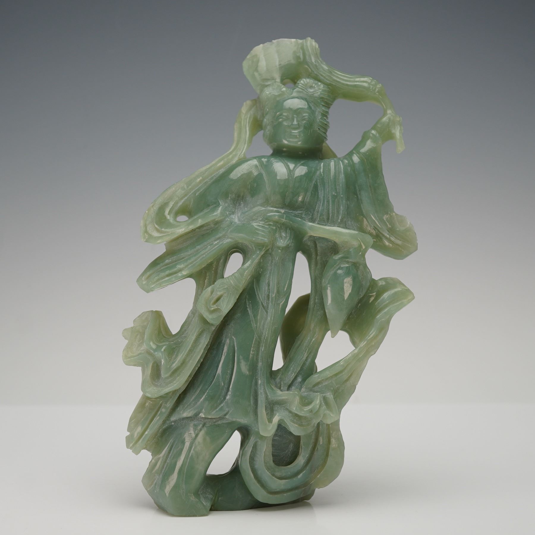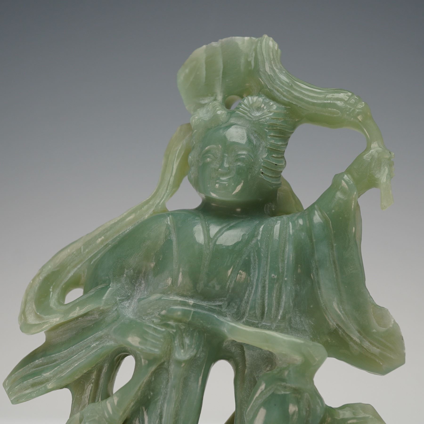 A finely carved green jade figure depicting an elegant celestial maiden, gracefully draped in flowing robes with delicately rendered folds and openwork details. The figure's serene face and elaborate coiffure are framed by swirling ribbons that extend outward, suggesting movement and vitality. The carving reveals subtle translucency within the stone, ranging from pale to deep green tones, highlighting the artisan's attention to texture and depth. The reverse side continues the intricate design, emphasizing balance and harmony throughout the composition.