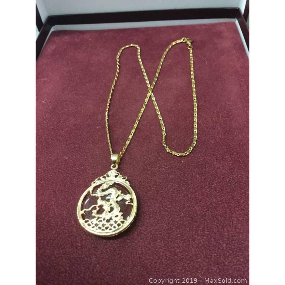 Chinese Carved Red Jade In Gold Tone Dragon Mount Pendant. The Pendant Is Accompanied With Necklace Shown In The Photos.