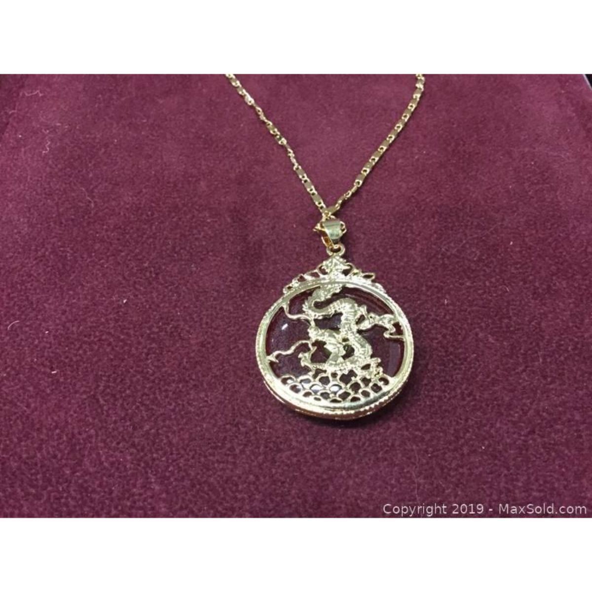 Chinese Carved Red Jade In Gold Tone Dragon Mount Pendant. The Pendant Is Accompanied With Necklace Shown In The Photos.