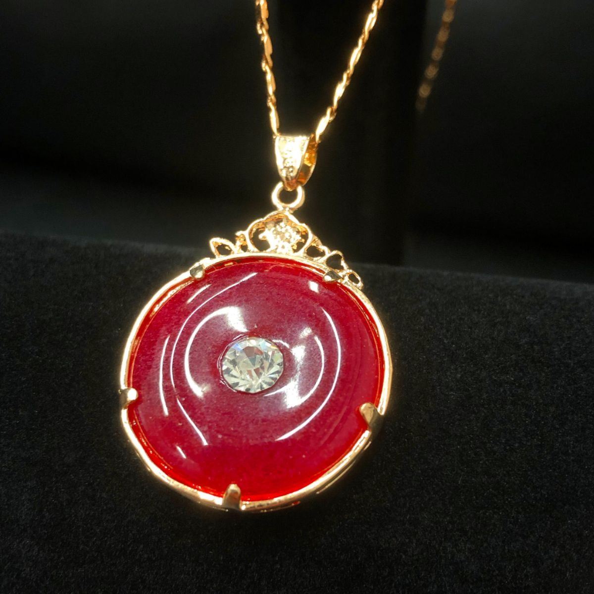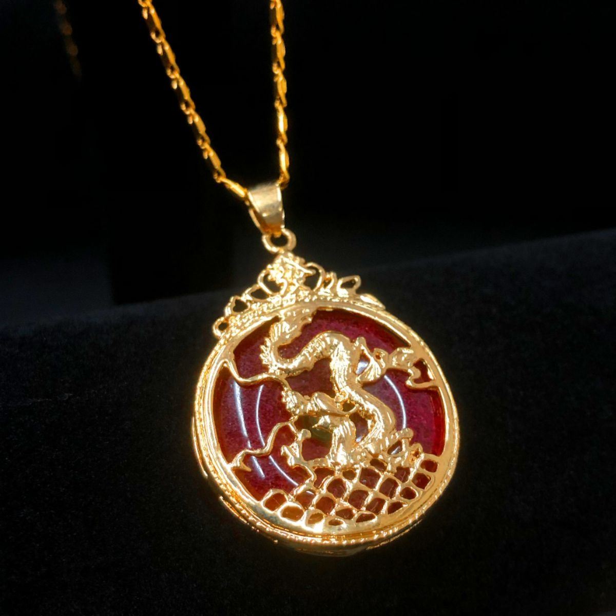 Chinese Carved Red Jade In Gold Tone Dragon Mount Pendant. The Pendant Is Accompanied With Necklace Shown In The Photos. Â