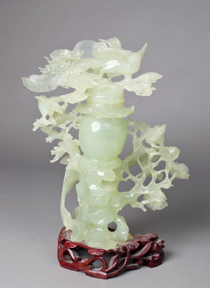 Finely carved to depict birds within a floral landscape with the stone a medium celadon tone on fitted hardwood stand 10"H not including the stand circa 20th century.