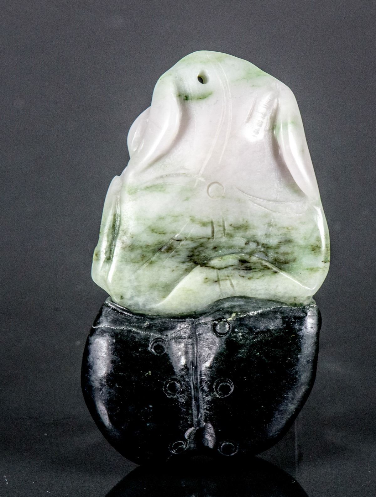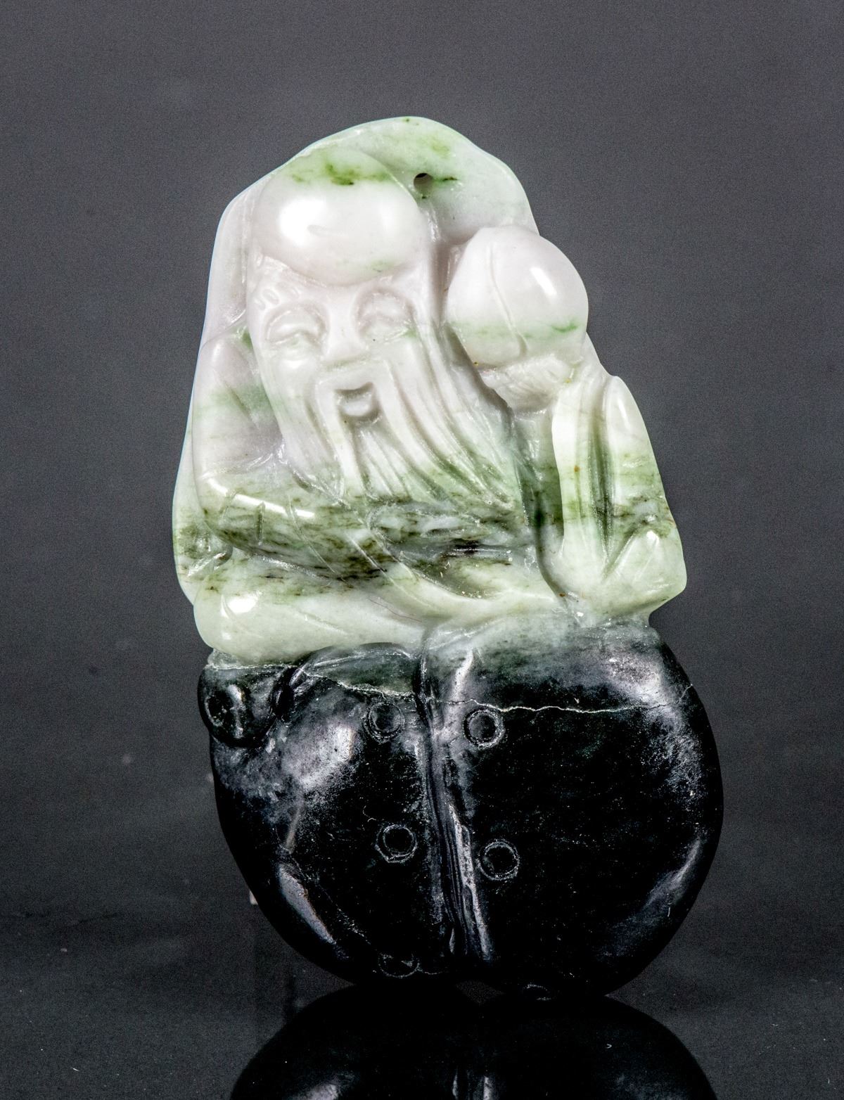 Chinese carved jade toggle; featuring Shou immortal holding a peach; of white and black tone with spinach green suffusions; H: 7 cm, W: 3 cm, 46 grams; Density: 3.07