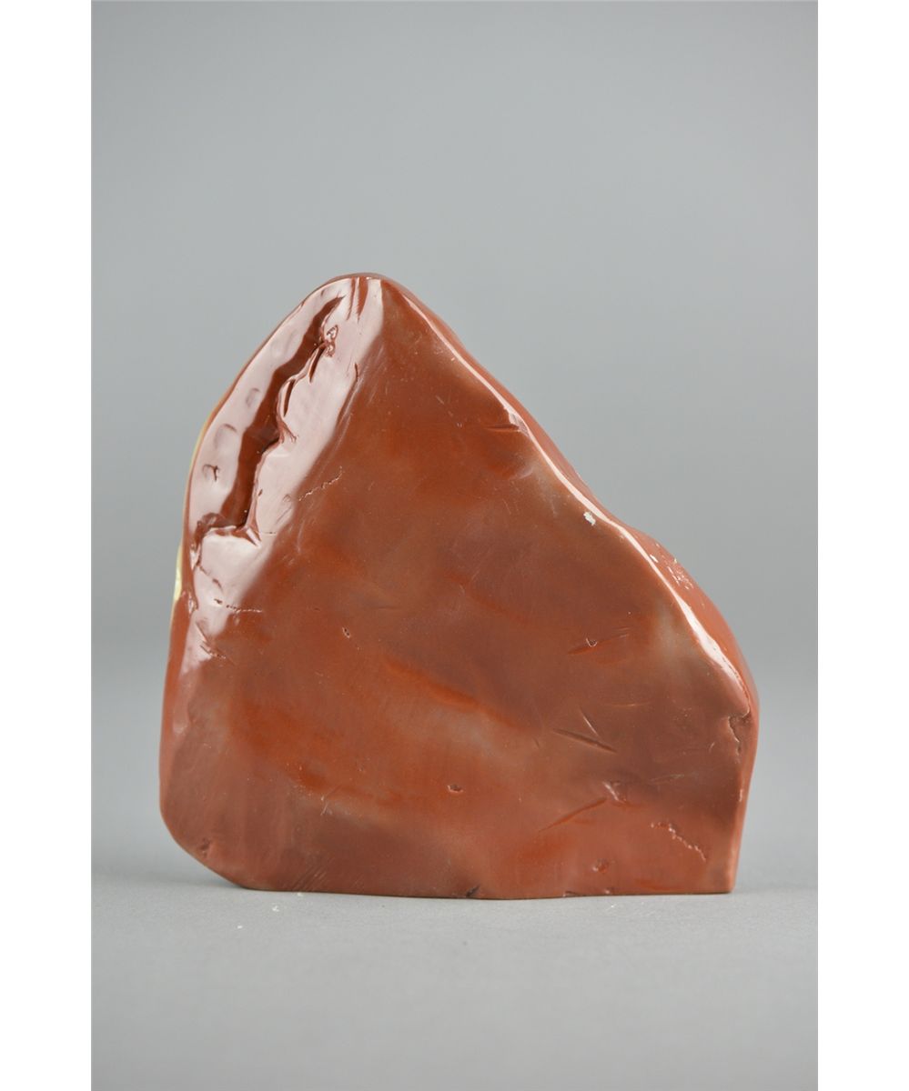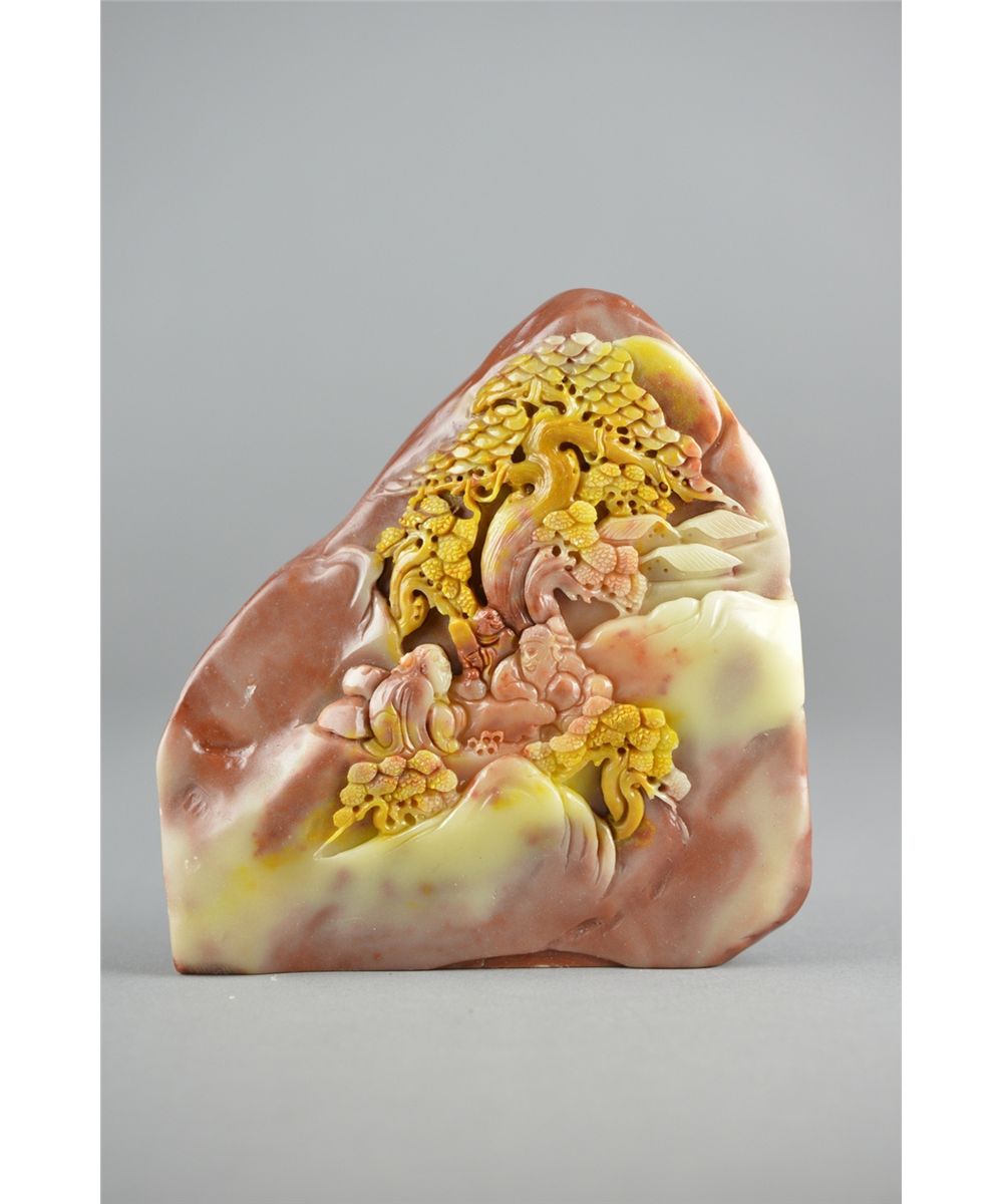 Chinese carved soapstone boulder; featuring landscape scene with two figure underneath a lotus tree in relief; the stone of yellow, red and white tone; H: 14 cm, L: 13.5 cm, 746 grams