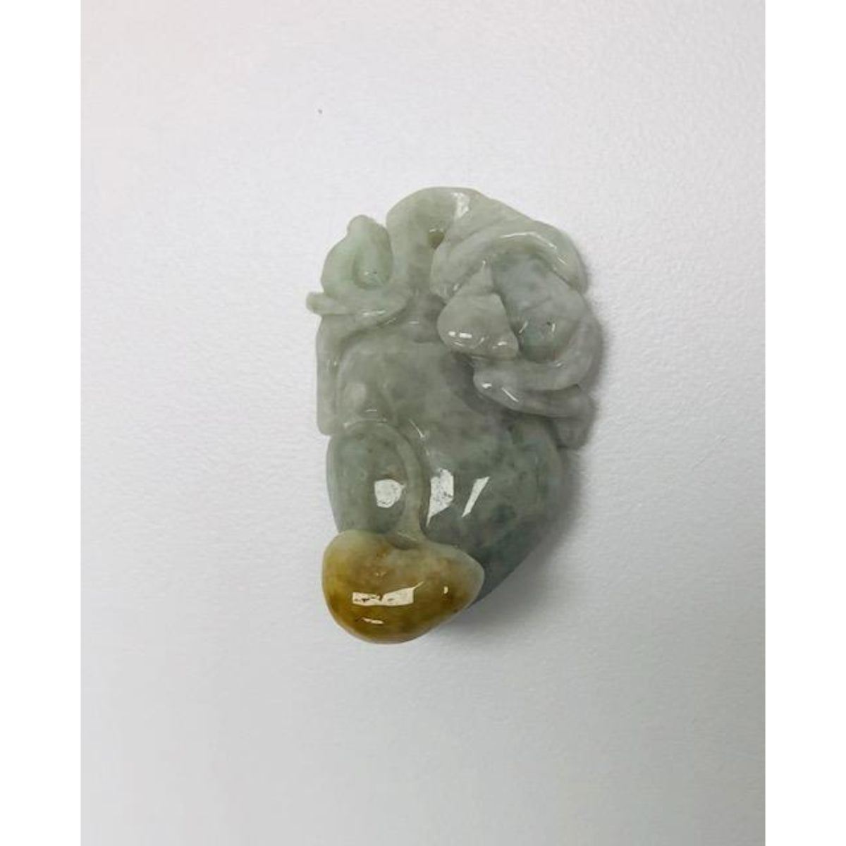 Chinese Carved Two Tiered Jade Fruit & Bat Pendant. A Fine Piece Demonstrating A Two Tiered Level In Carving. A Vine Off The Main Piece Of Fruit Stands To The Fore Front, With Difference In Hue To Bring Emphasis To The Two Tiers To This Carved Piece. A Perched Bat On The Top Part Of The Pendant Adds To The Elegant Design Of This Pendant. Please View Photos For Further Details.Â