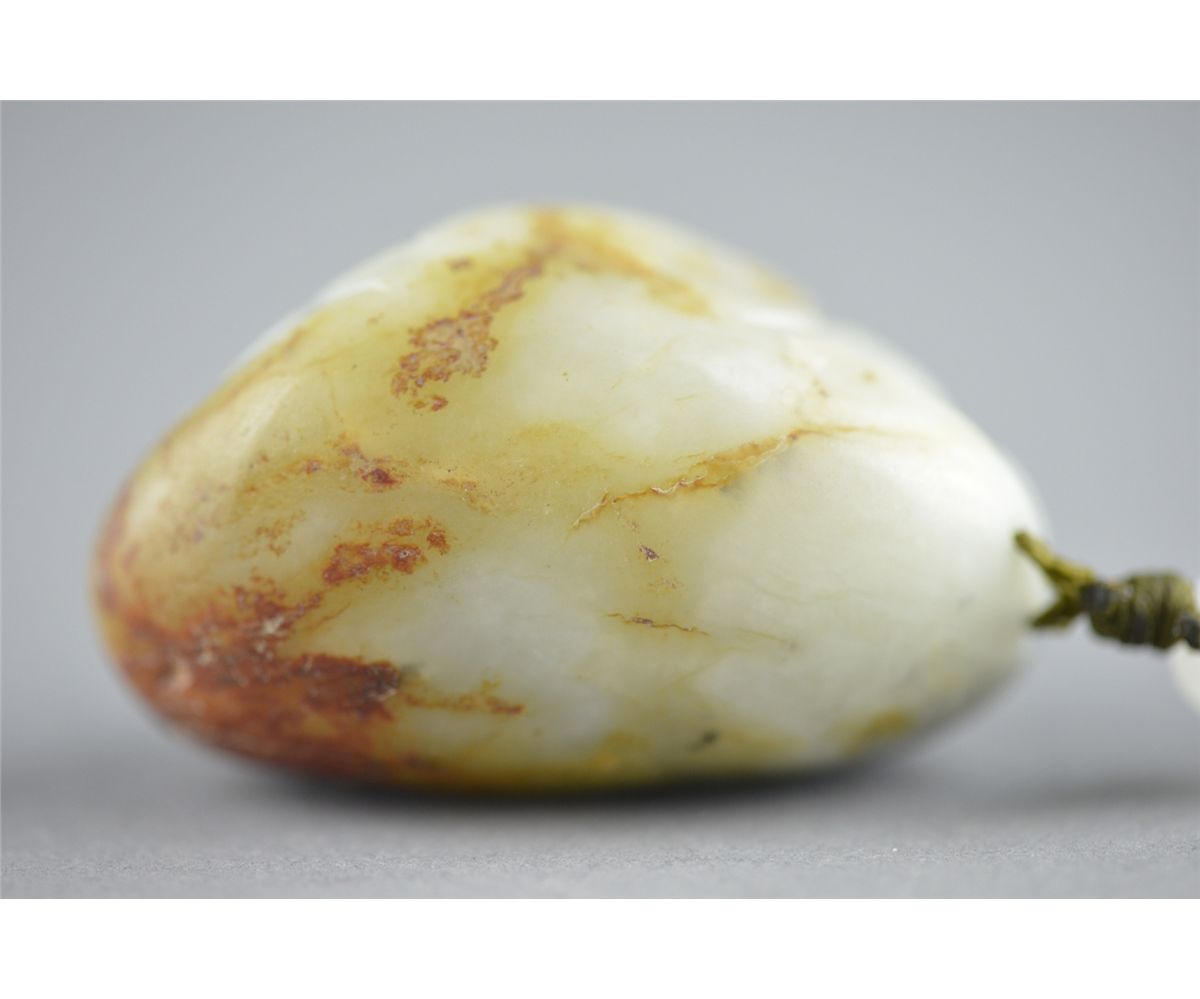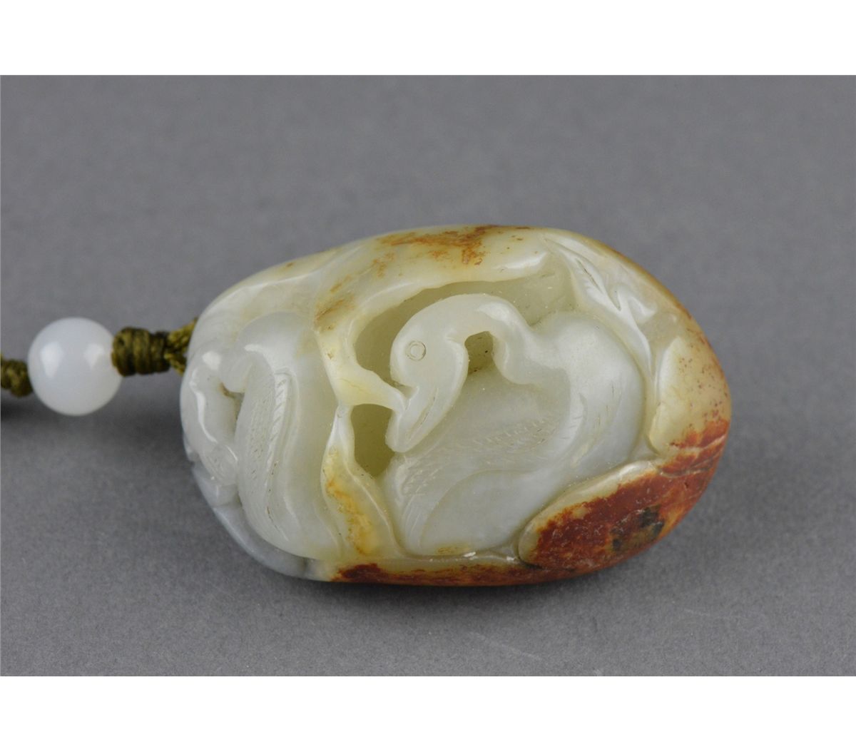 Chinese carved Hetian jade pebble toggle; featuring carved ducks in relief; the stone of translucent white tone with dark brown and yellow suffusions; L: 5 cm, W: 3 cm, 62 grams