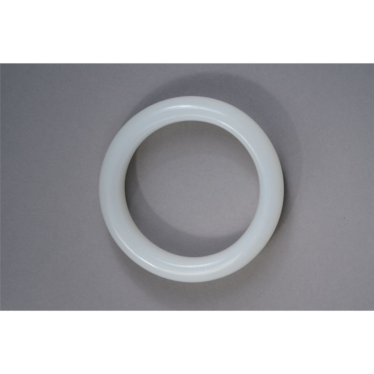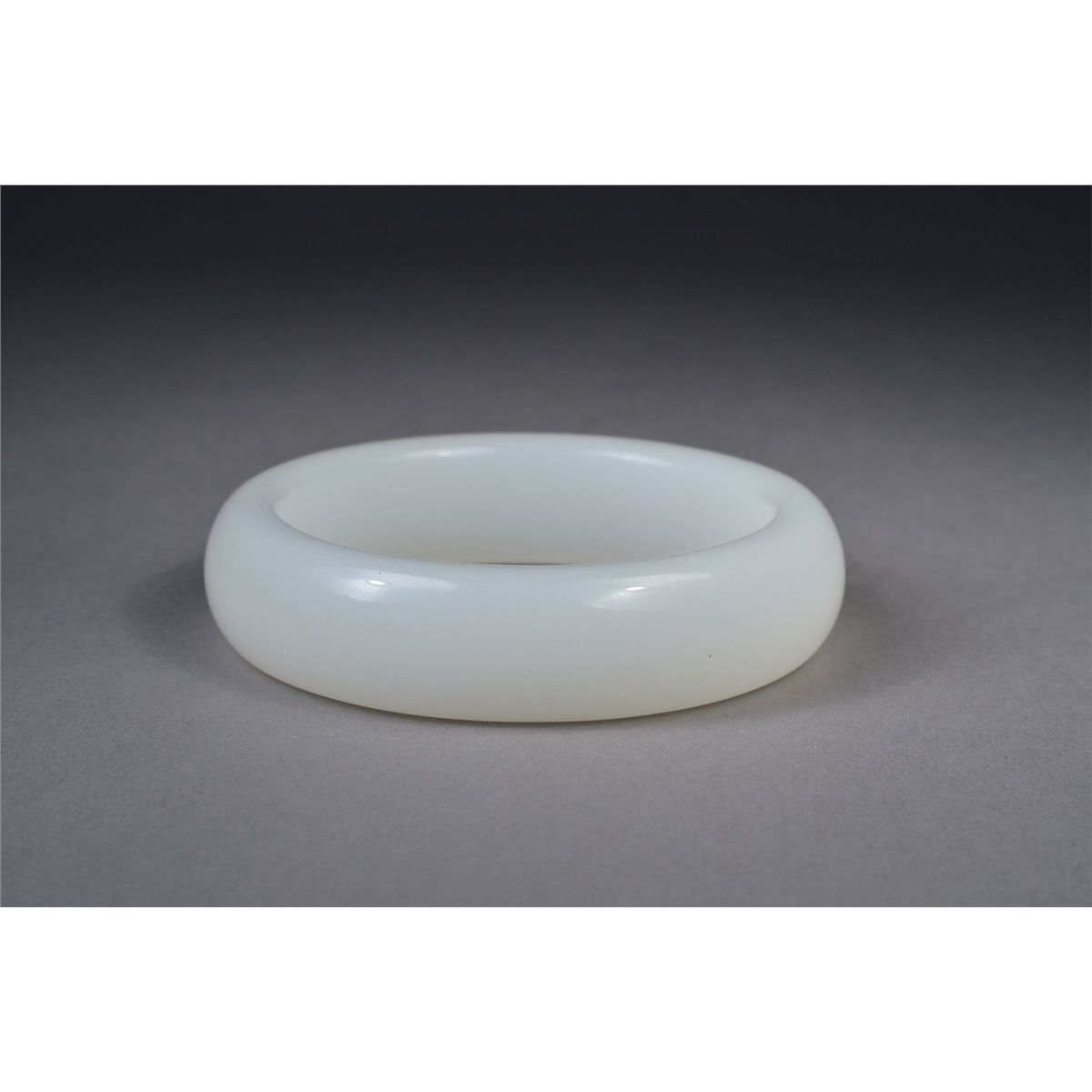 Chinese carved jade bangle; the stone of even translucent white tone; D (exterior): 8 cm, D (exterior): 6 cm