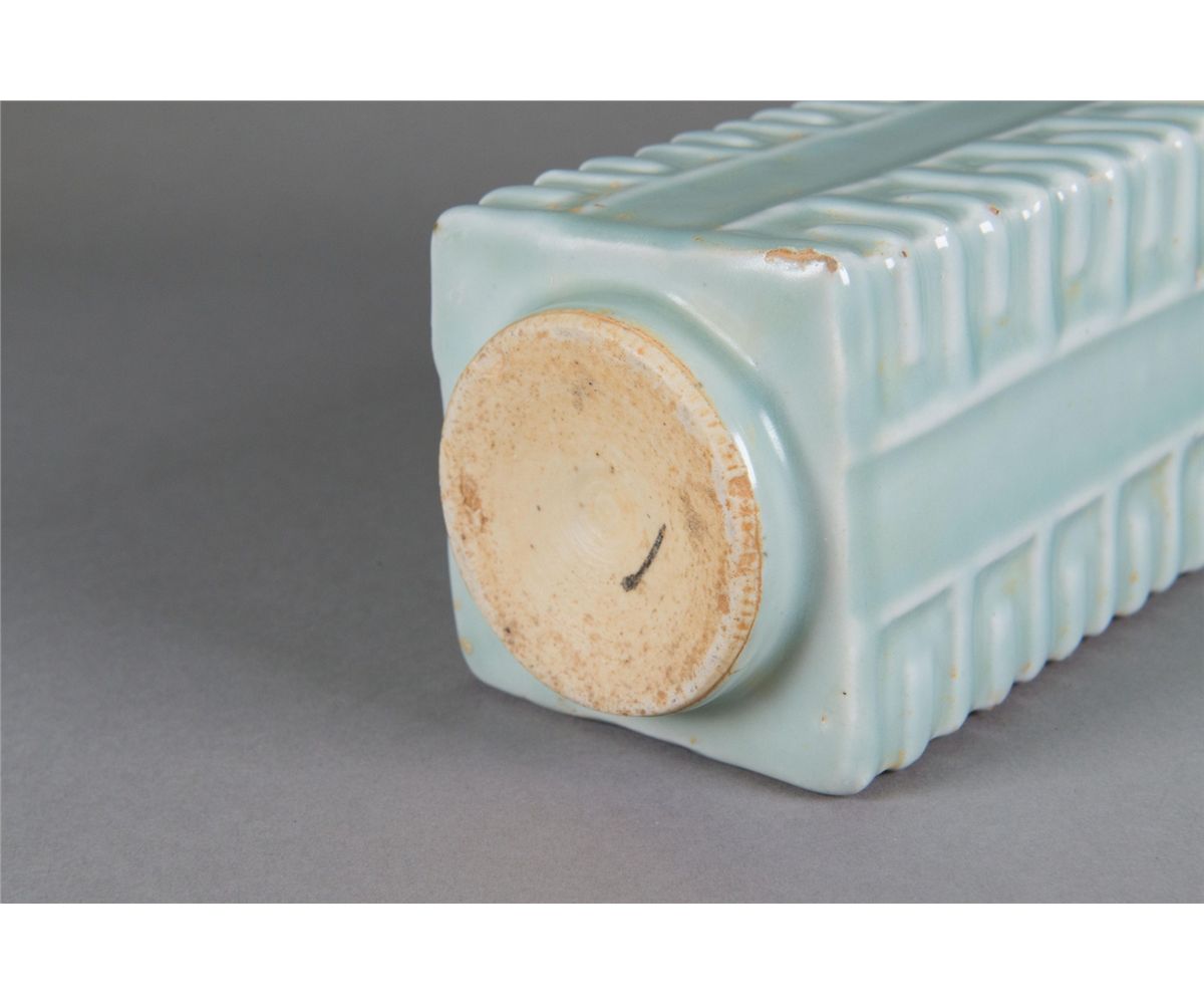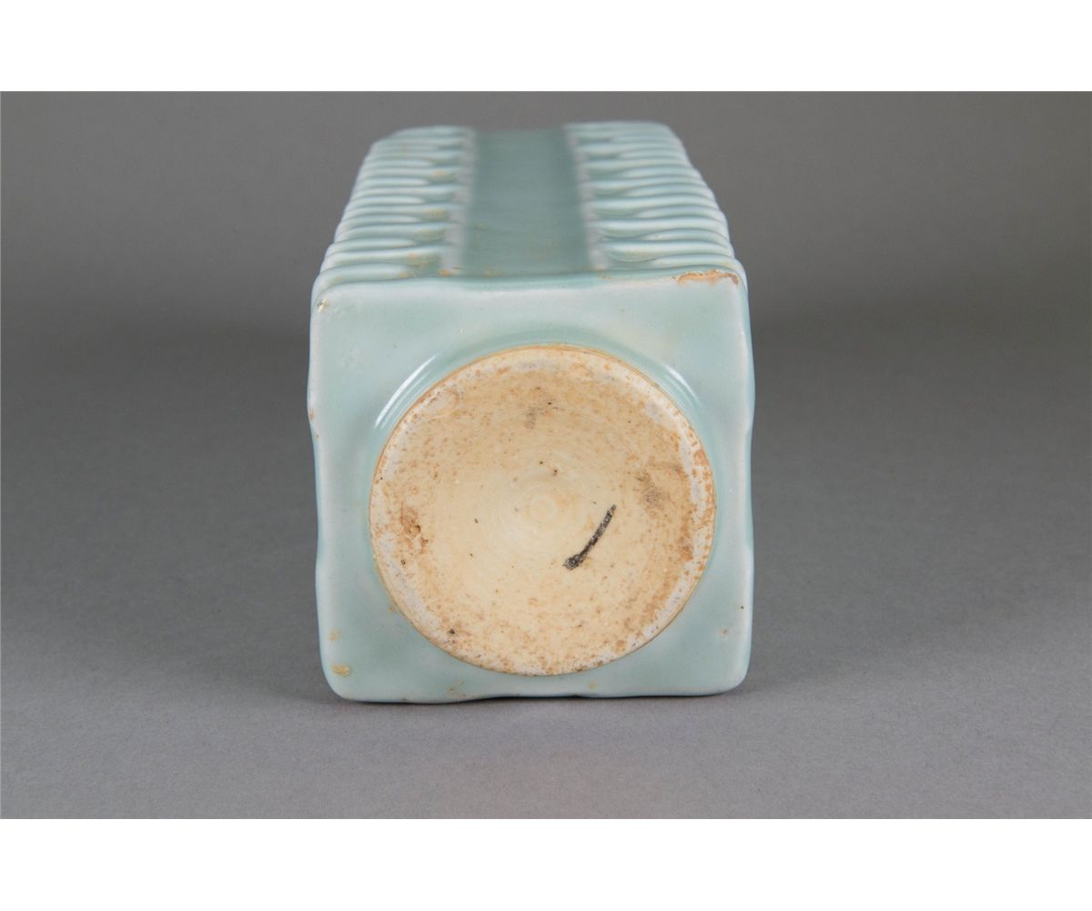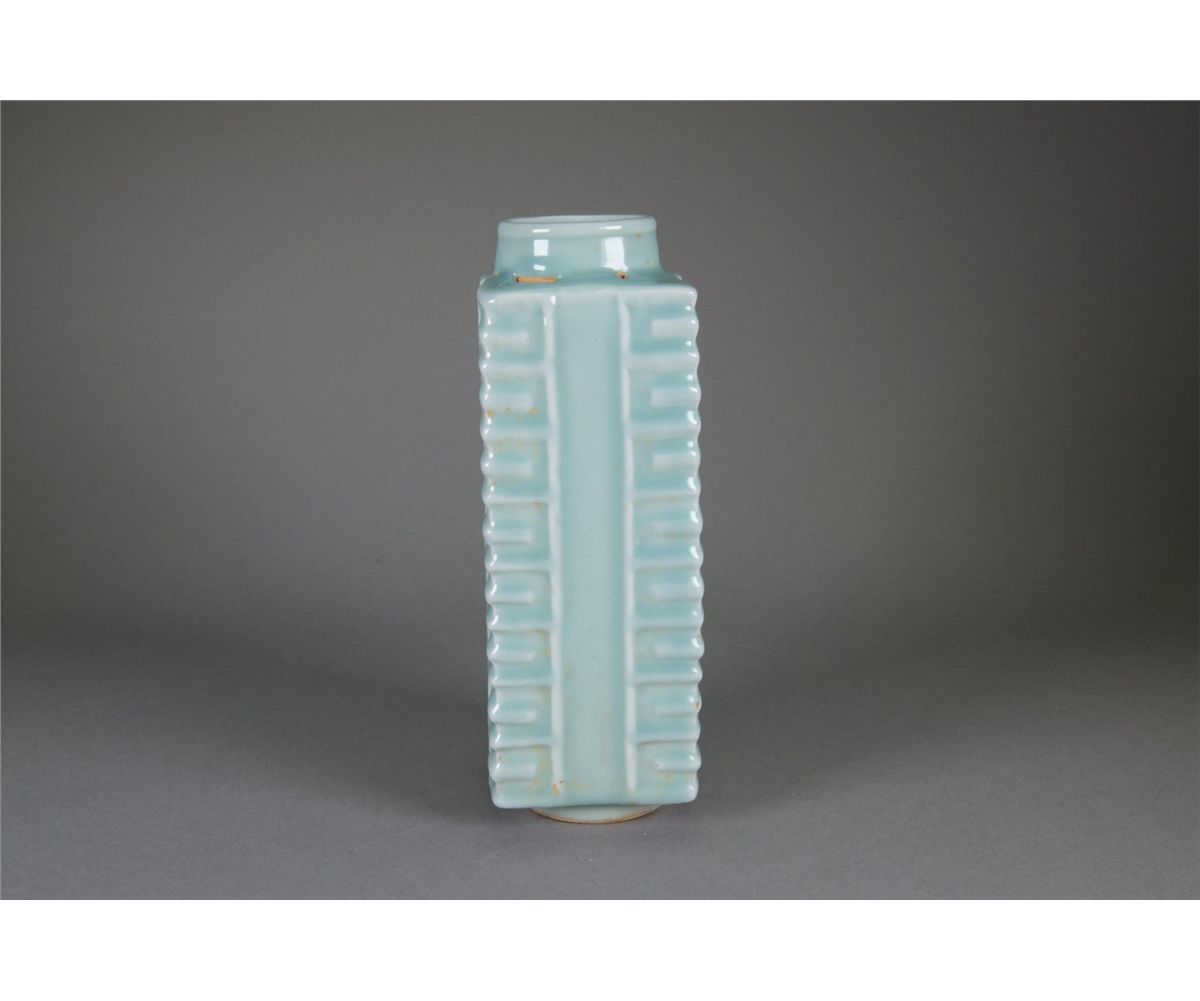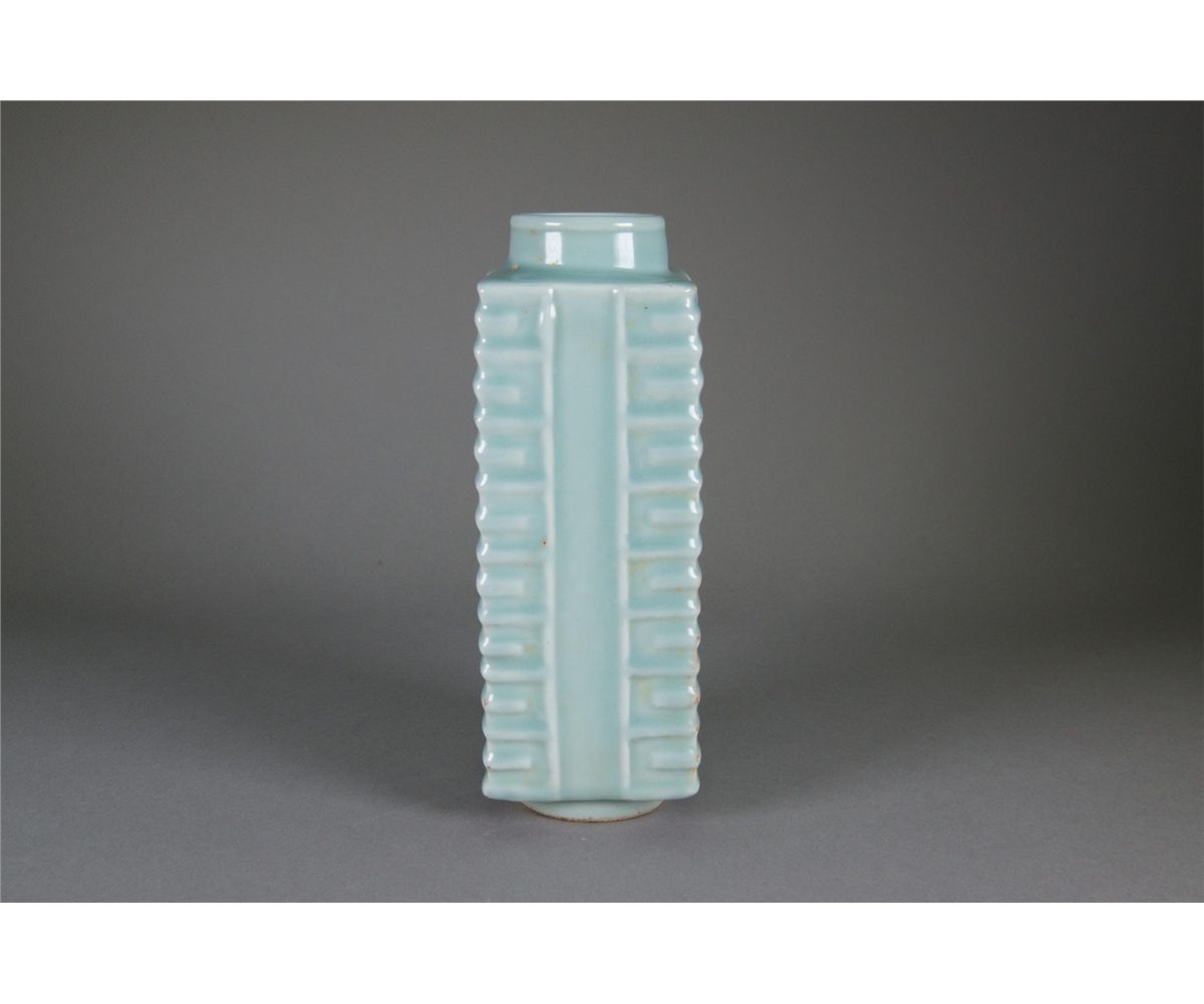 Chinese celadon glazed cong vase; comprised of square outer section and round inner section; of celadon glazed; H: 25 cm, W: 9 cm, 1373 grams