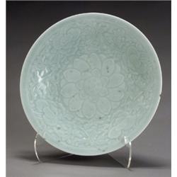 Chinese Celadon Glazed Charger, 19th Century, The interior carved with lotus scrolls. Some gl...