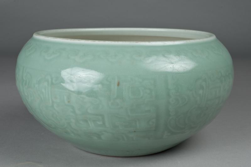 Finely molded to depict archaic panels, the rim decorated with ruyi, the foot rim glazed white. 12" Dia. X 6.75" H. Circa 19th/20th Century.