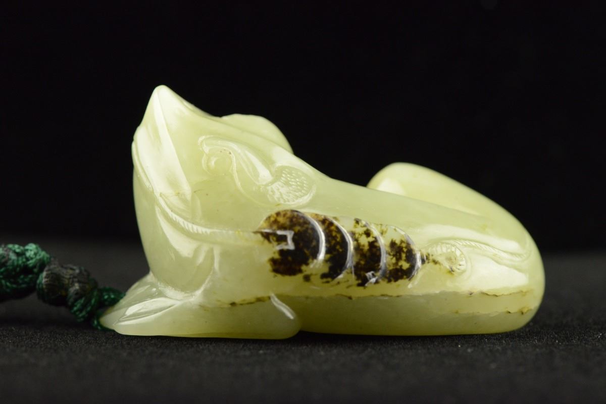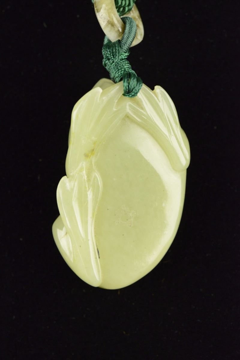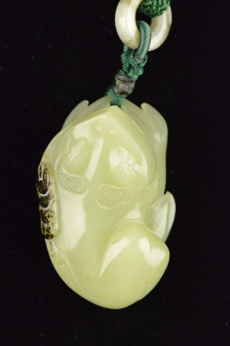 Lustrous Chinese carved hardstone toggle, of celadon tone with brown inclusions, featuring cash toad with a string of cash coins. Suspending onto hanging string. H: 5 cm, W: 3 cm, 66 grams. Provenance: T. Ng Collection Toronto.