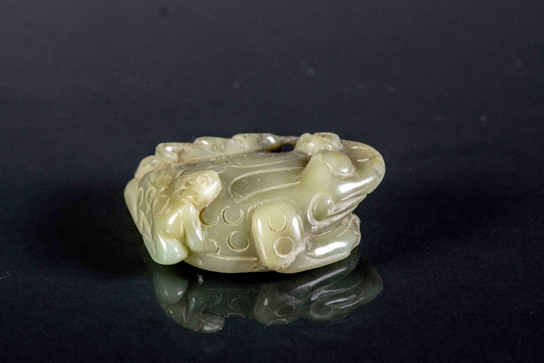 Chinese celadon jade carved frog toggle; featuring a frog surrounded by Chinese coins; of celadon tone; H: 2 cm, W: 4.5 cm, 49 grams,Density: 2.9