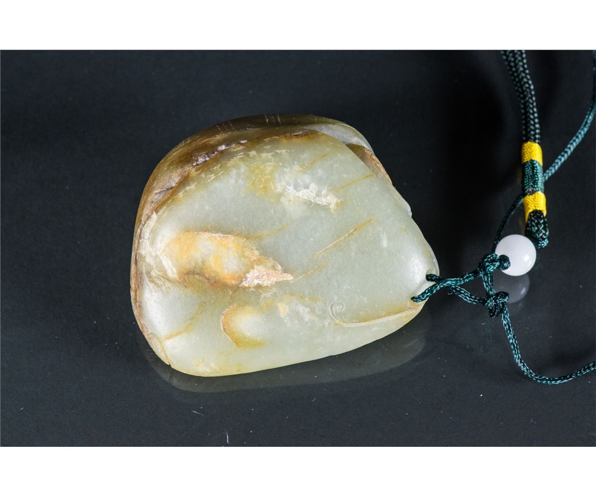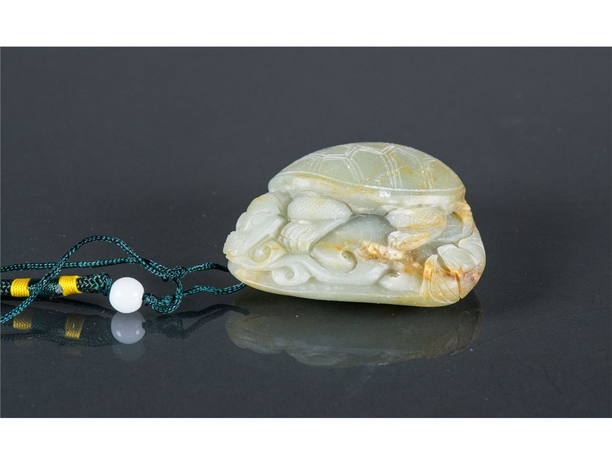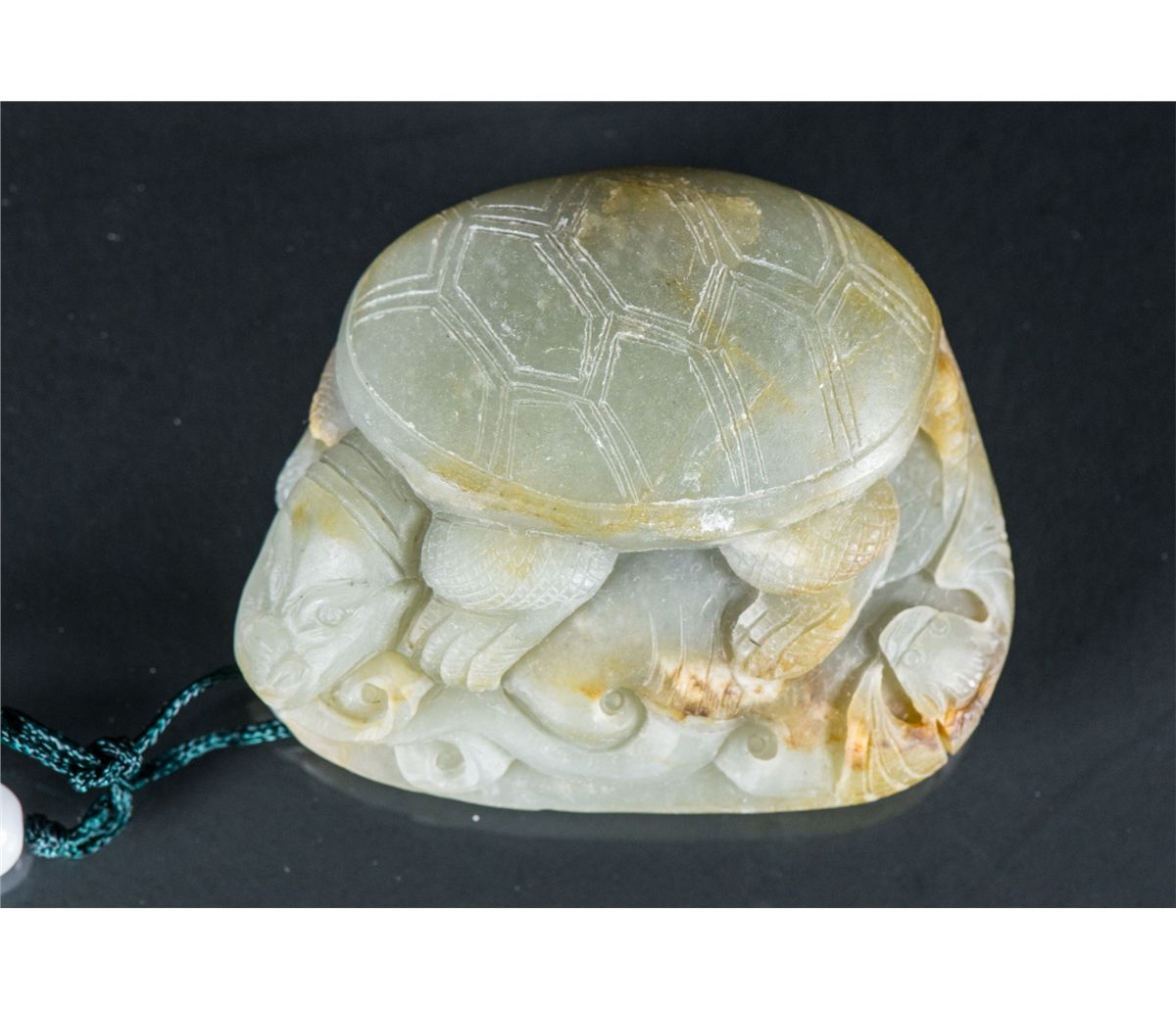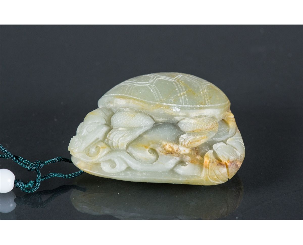 Chinese celadon jade carved toggle; featuring a turtle on waves; of celadon tone with russet suffusions; H: 6.5 cm, W: 6 cm, 139 grams