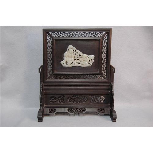 Chinese Celadon Jade Inset Table Screen. decorate with mother and daughter. good condition. 6.5" x 4.25" jade itself.