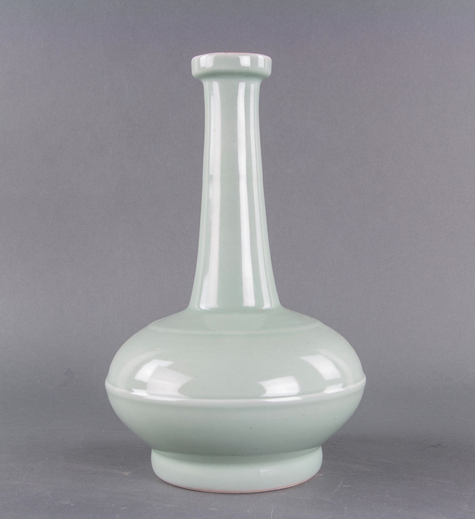Chinese celadon porcelain vase; of compressed globular body with long narrowed neck; covered by celadon glaze; six-character Yongzheng mark on base; 33 cm x 20 cm, 2167 grams