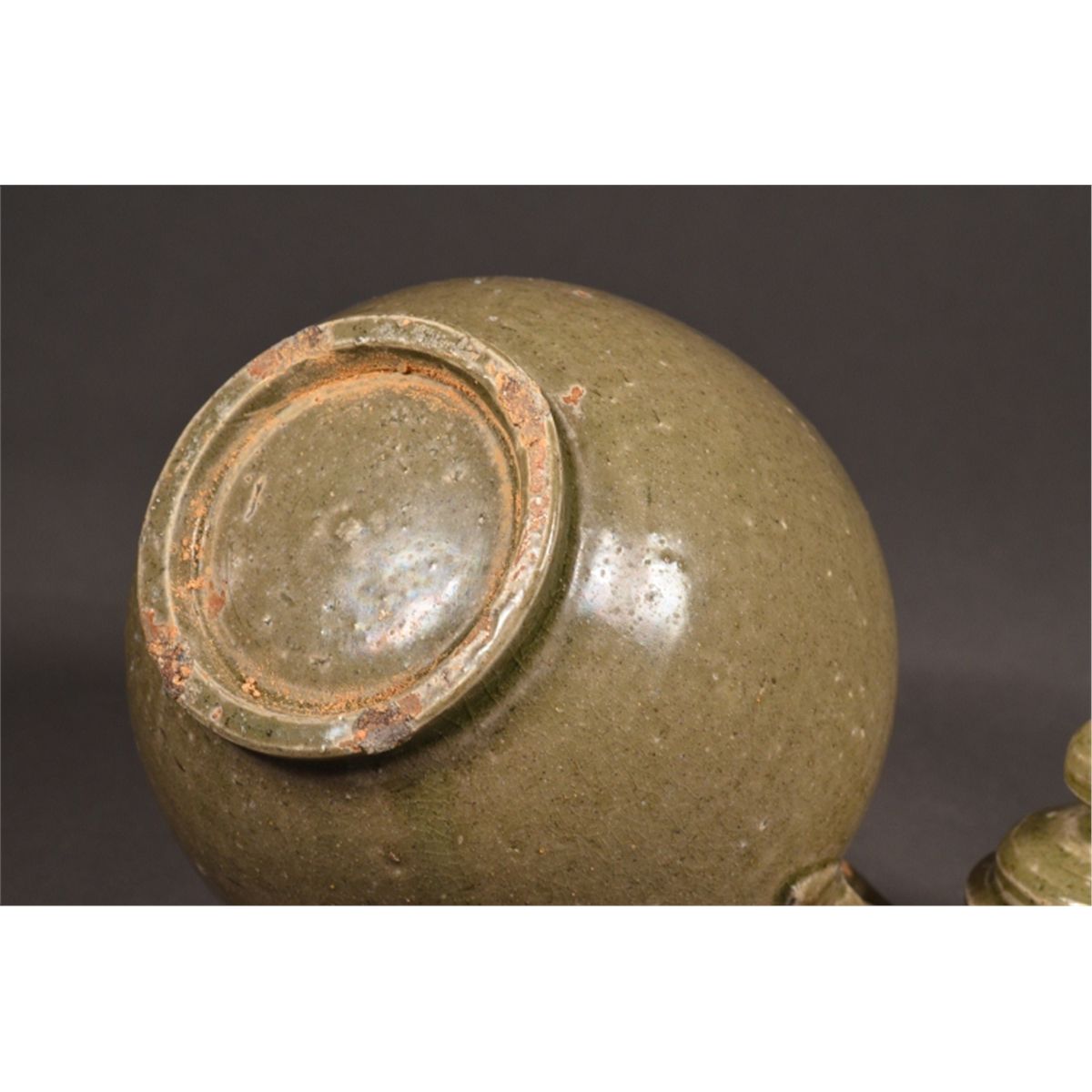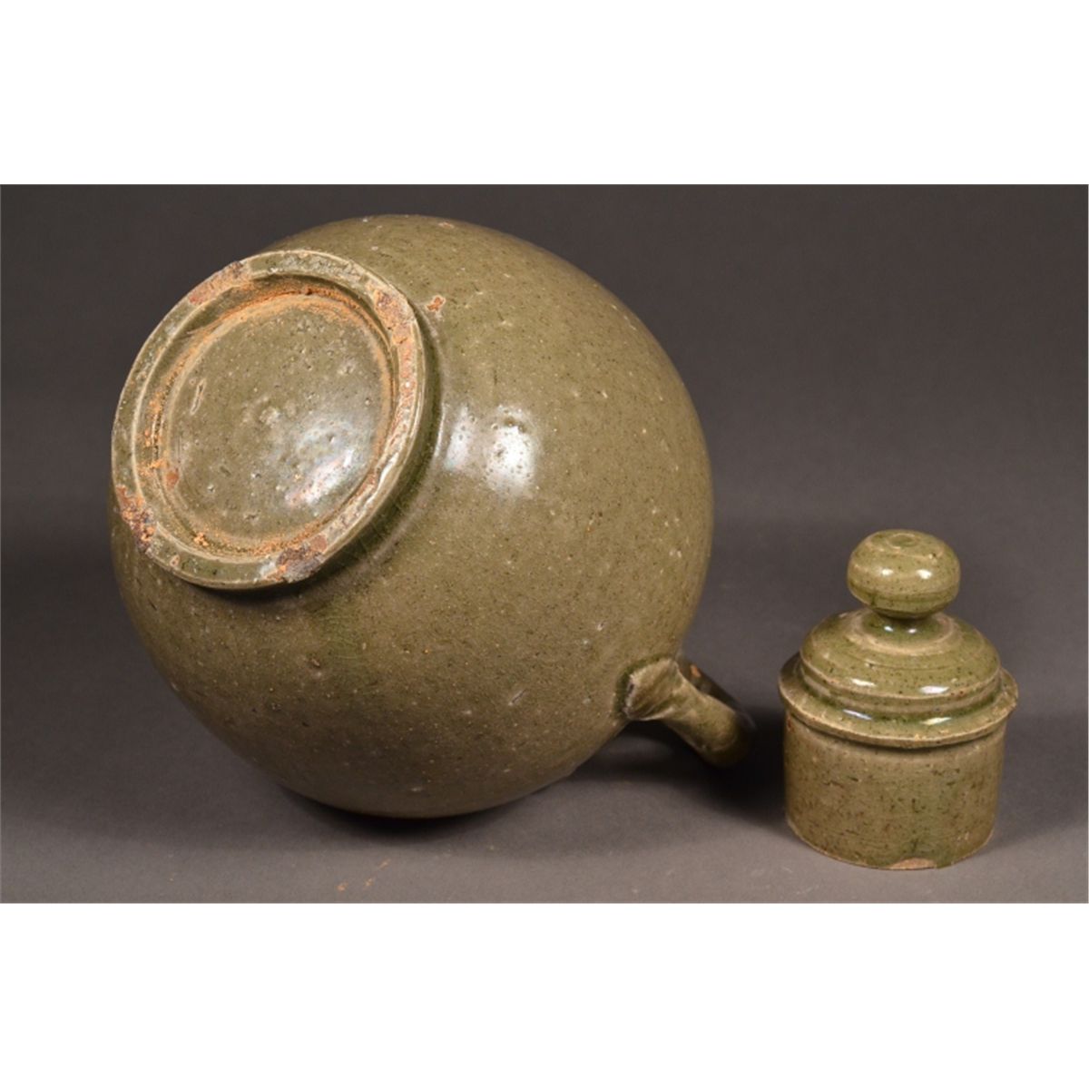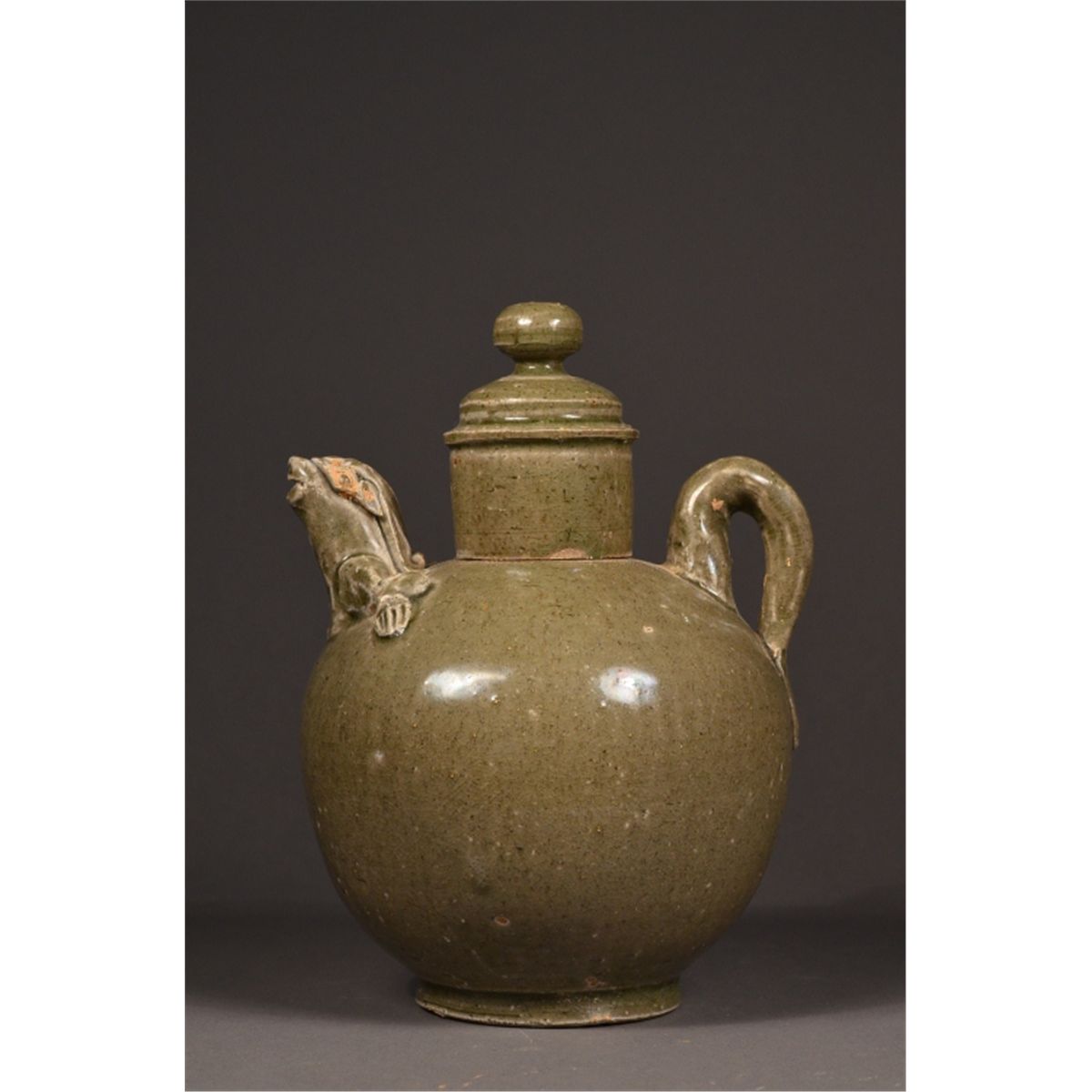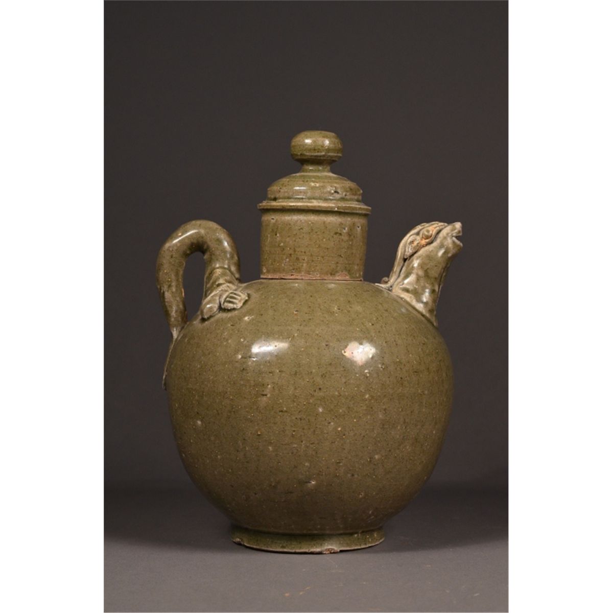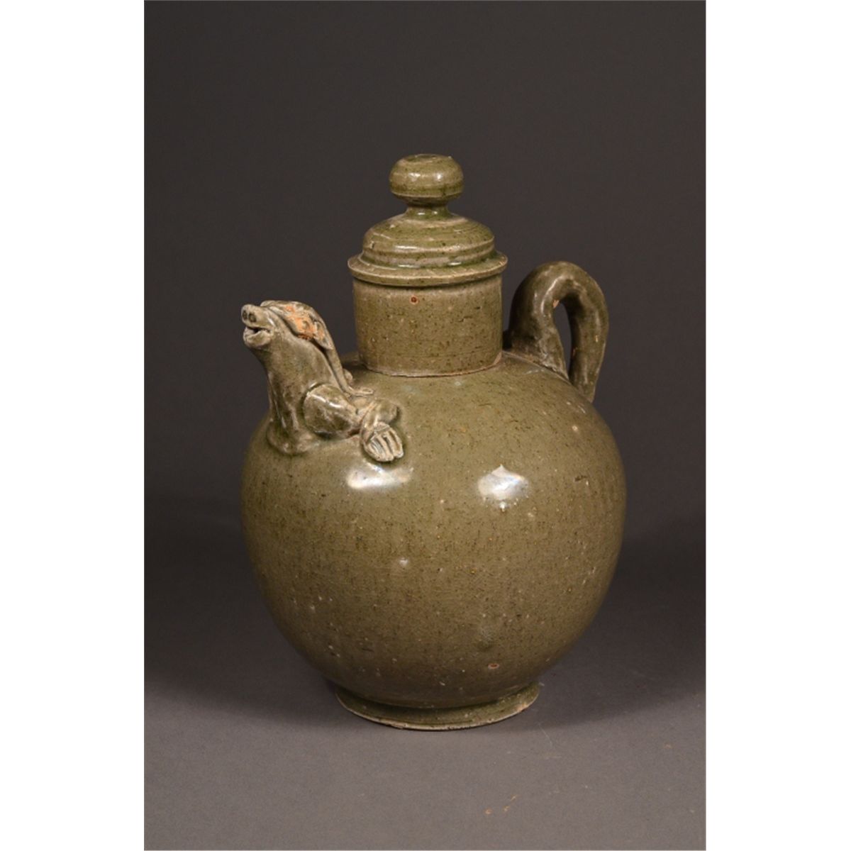Chinese celadon porcelain teapot; featuring lion head spout and tail handle; low foot ring; 7" tall, 5" diameter