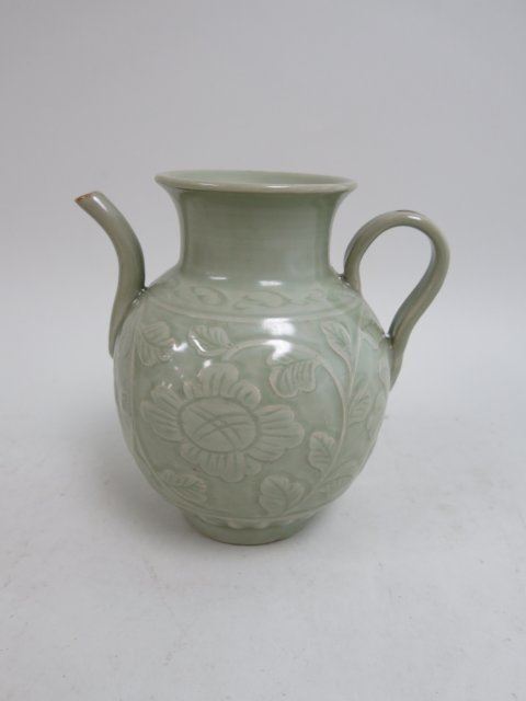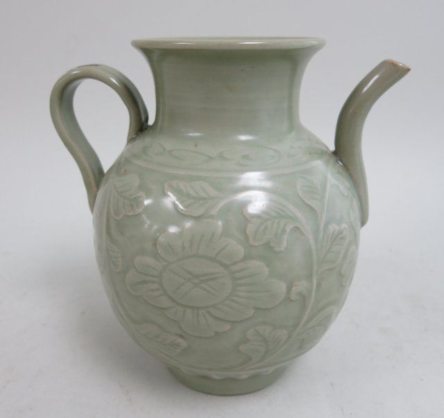Floral embossed design. Possible from the Early or Song Dynasty. Approx. 8 1/4" H. No guarantee of authenticity or provenance.