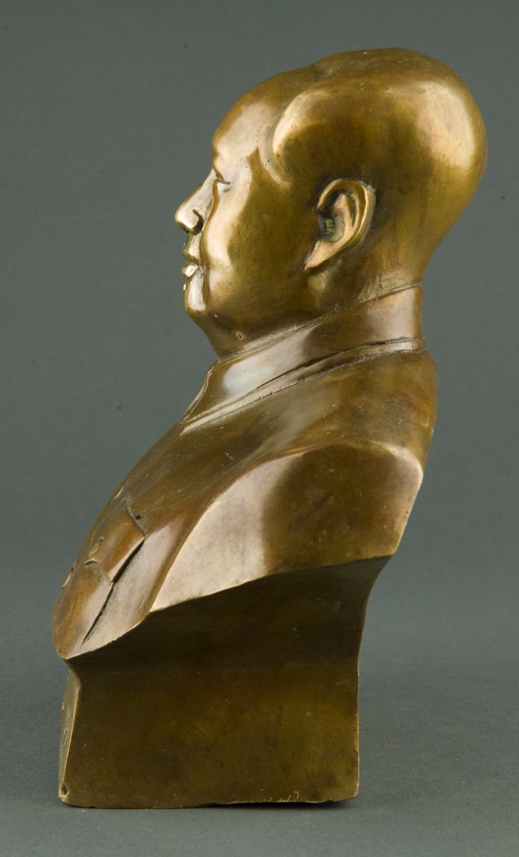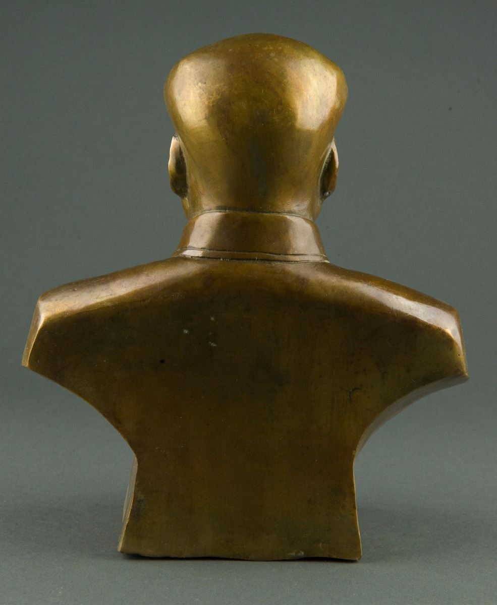 Chinese Chairman Mao bronze statue on raised base. Base marked Mao Zhu Xi Wan Sui. H: 21 cm, W: 18.5 cm, 2258 grams.